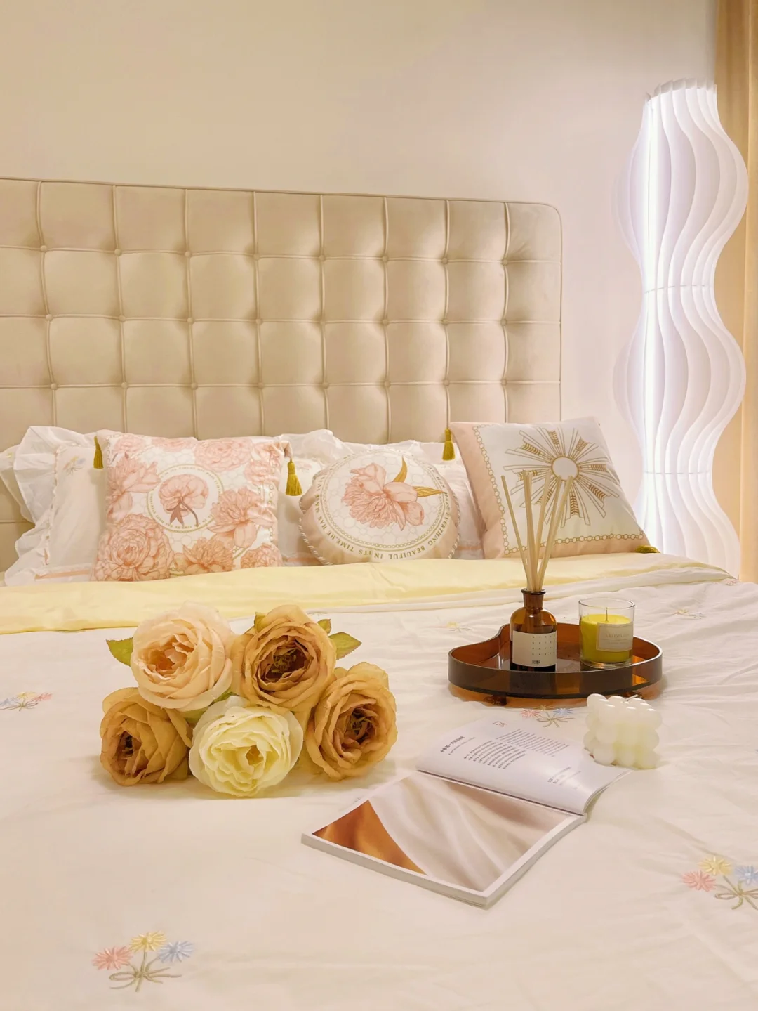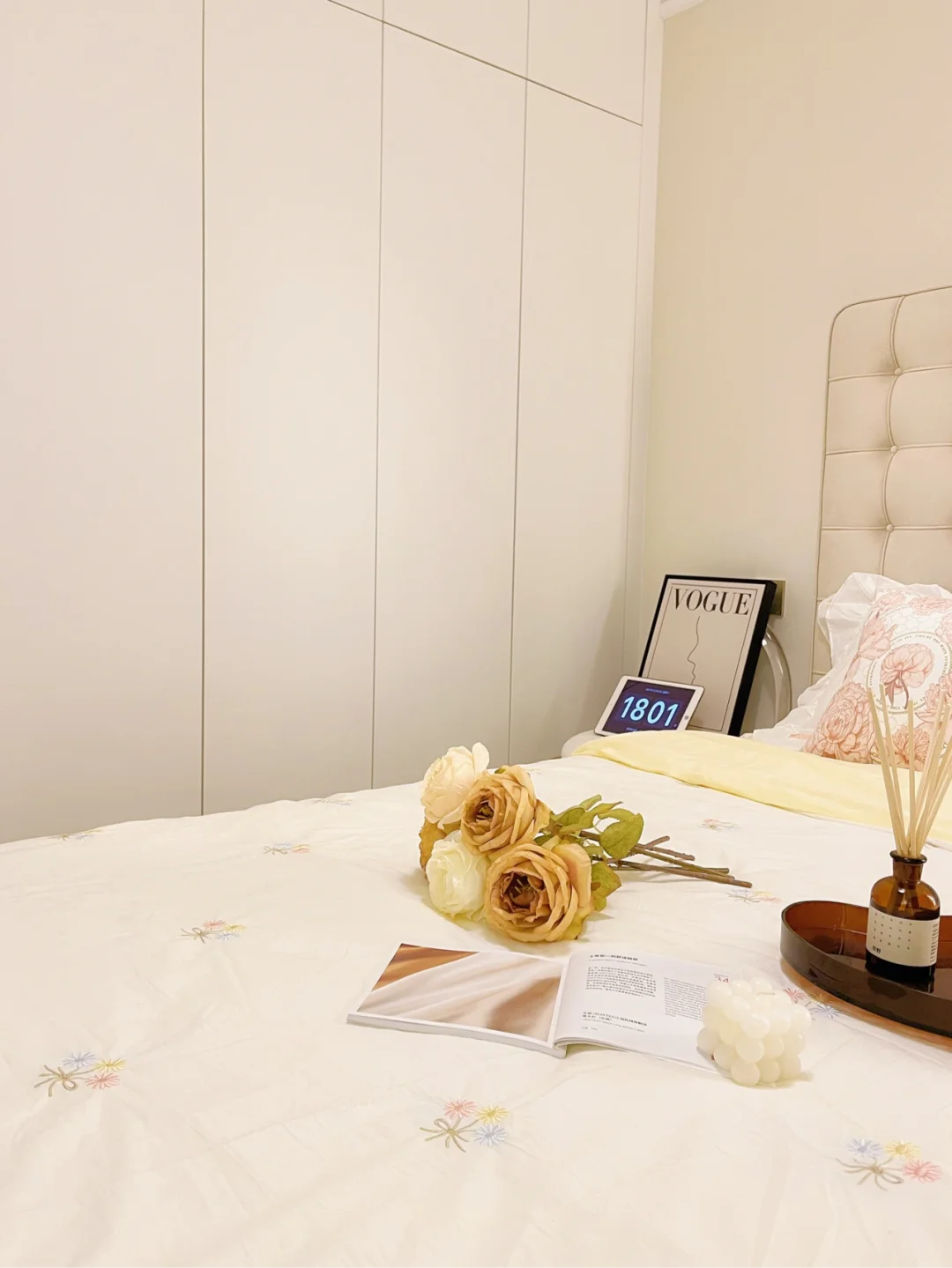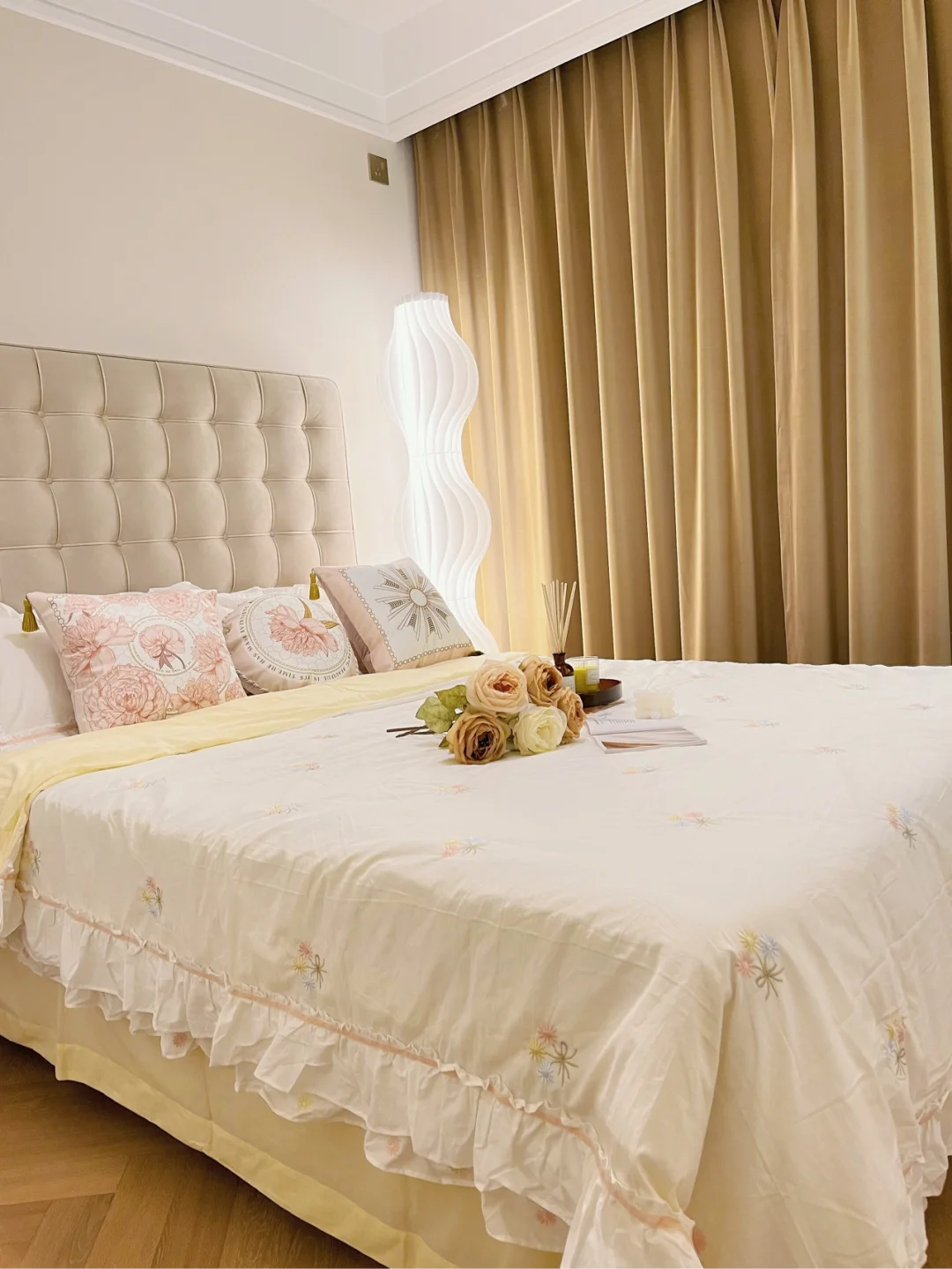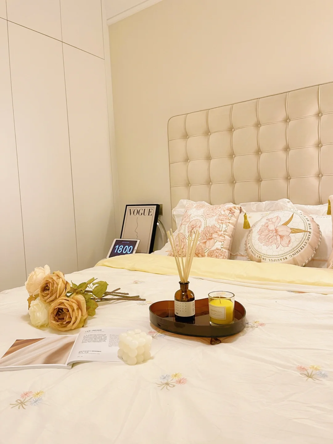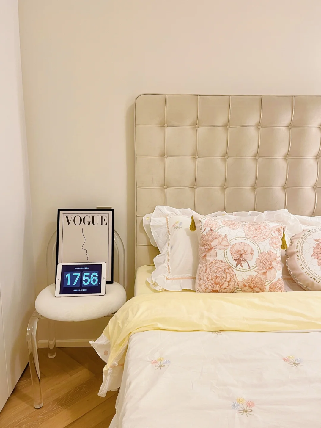 选床的时候就打算选择奶油色,丝绒材质的靠背搭配米杏色,整体效果就是我喜欢的温柔奶油感。因为卧室实在太小,床架建议选择齐边结构哦!