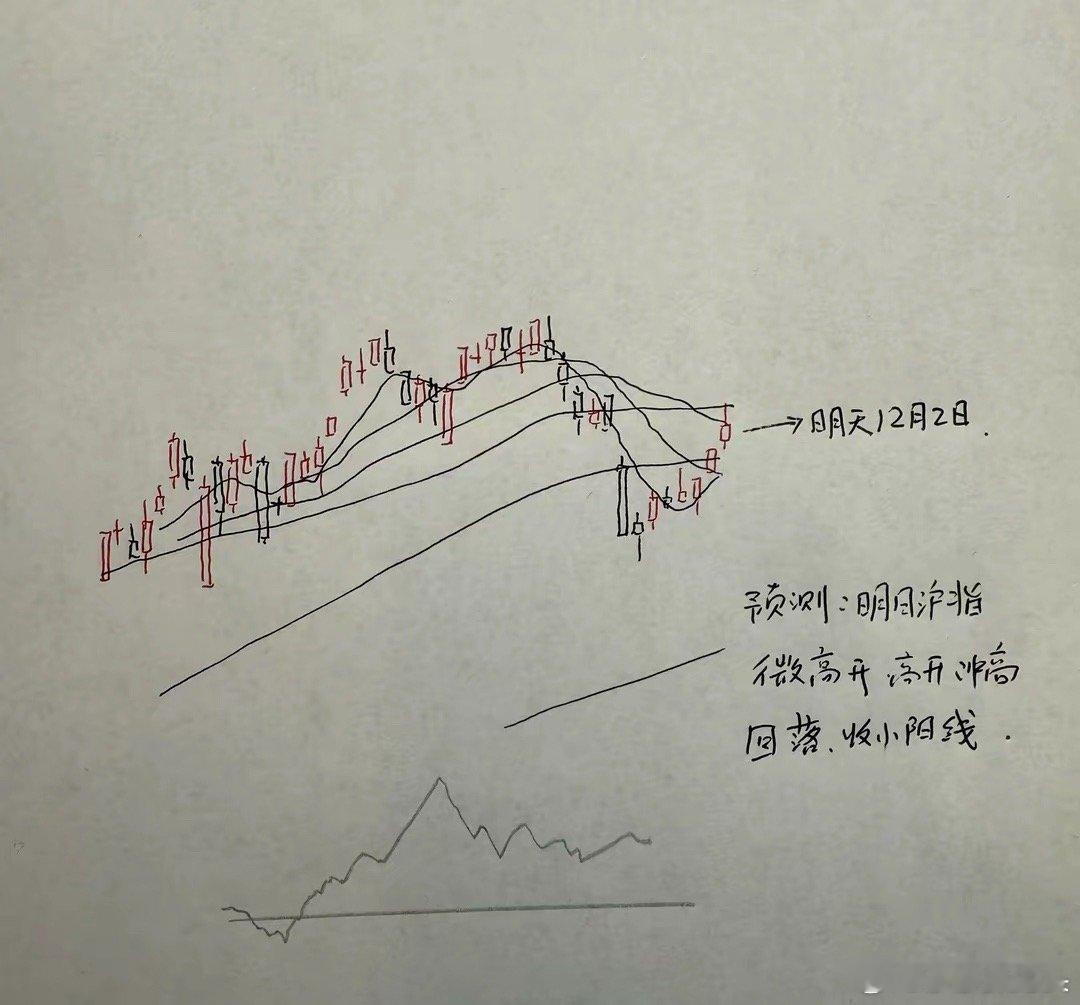 今天12月1日开门红,明天A股怎么走?到底是涨是跌?莎莎坚定看涨,大家来听莎莎说三个具体理第一, A股自8月份以来,每一次小波段上涨的幅度,都在160个基点或者190个基点的样子,如果接下来的上涨波段与历史上的走势相对称的话,上证指数从3816点的最低点,到今天为止,阶段反弹才98个基点。那么就还有比较明显的上行空间。大家请看图一上证指数日线图。第二,今天三大指数顶住了外盘股指期货调整的压力。并且今天实打实的放出了巨量。三大指数的成交额较上一个交易日巨幅增量近3,000亿。不仅能够逆着外盘上涨,而且还能够增量上涨,并且上证指数今天收盘几乎收在最高价。这种走势代表了市场多头非常的有信心,并且代表了明天有较大的概率继续上行。第三,最近小盘个股的走势一直比较强劲,代表小盘个股走势的中证2000指数,目前反弹的力度已经超过了本轮调整以来的0.618黄金分割位。一旦超过0.618黄金分割位,意味着短线的反弹很有可能转变为反转的性质,大家请看图二。所以,综合以上分析,对于明天市场的走势,莎莎依然维持乐观的判断,我认为明天指数很有可能再次走出加速走势。不过因为明天市场再上涨的话,短线上涨的时间以及空间都已经比较明显了,所以明天我们要小心指数在冲高之后,有可能出现冲高回落的可能性。那么明天A股到底怎么走?大家请看图三关于明天走势莎莎手绘的预测图对于市场走势的分析,莎莎多半从纯粹的技术面出发,对于消息面和基本面的分析则相对较少,我的观点不一定正确,仅代表个人见解,不代表任何投资建议。最后莎莎还想补充一点的是,最近市场从4034点最高点以来的下跌,一直下跌到3816点,一共有200多个基点的跌幅。这一段的下跌我都提前预判,并且让大家规避了。而从3816点低点以来的反弹,到目前为止,又全部让大家把握到了。作为一个纯技术派的老手,我个人还是非常开心的。不过也不得不说的是,对于市场走势,像我这样的极限判断,其实确实是在挑战非常高的难度。所以如果有时候市场的走势并不及我的预期,那么也请大家能够理解。因为毕竟市场的变化真的是无穷无尽的。兄弟朋友们点赞,评论加关注就是对莎莎这个纯技术派的最大支持。