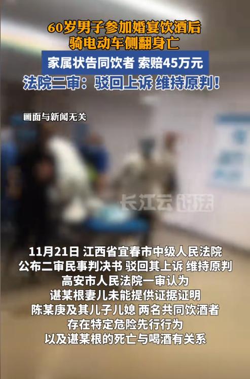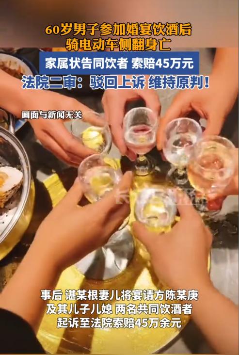 江西宜春,60岁男子收到老战友的邀请,去参加战友儿子的婚宴。席间男子和友人交杯换盏,边喝边聊,十分开心。酒席结束后,男子独自自行骑着电动车回家了,谁知途中发生交通意外不幸身亡。案发后,男子的家人将战友一家告上法院,要求他们承担死亡赔偿金、误工费等,合计45万余元。(来源:长江云新闻) 据悉,谌大爷和陈大爷、邹大爷、简大爷是老战友,四人的关系十分的不错,退伍后就一直保持着联系。 2023年10月4日,是陈大爷的儿子小陈与儿媳曾女士的结婚大喜的日子。中午12点不到,谌大爷、邹大爷、简大爷收到邀请后,纷纷赶到了婚礼现场祝贺。 谌大爷住得距离陈大爷比较近,所以他是直接骑电动车去的,当时觉得酒店可能会不好停车,所以就把电动车停在了酒店附近的一个大商场边上。 谌大爷来到酒店时,发现多年的好友王某和陈某也在。这两人可是谌大爷年轻时就认识的好友,也是陈大爷的好友,已经有好多年没见过面了,所以几人一见面就聊了起来。 由于难得的相聚,谌大爷和王某、陈某在吃饭时就坐在了一桌,期间多喝了几杯,大概2两白酒,心情顿时十分的舒畅。 在婚宴结束后,谌大爷告别了王某和陈某,与老战友简大爷、邹大爷一起走路到附近的商场,然后骑着电动车独自回家去了。 可谁能想到,本来看起来一切正常的谌大爷在骑着电动车时,不慎连人带车摔在了地上。路人见状给谌大爷叫了救护车,但送到医院后不久,谌大爷就不行了。后经鉴定,谌大爷的血液中酒精含量为22.17mg/100ml,只能算是轻微酒驾。 警方为了查明谌大爷真正的死因,于是向谌大爷家属做了解释,希望能解剖尸体做进一步调查,但是谌大爷的家属却不同意尸检,这就导致无法知晓谌大爷的死是因为喝酒,还是自身疾病导致。 在得知谌大爷去世的消息后,陈大爷等一众战友和好友也十分惋惜,可令他们没想到的是,谌大爷的家属竟然把陈大爷、陈大爷的儿子儿媳、王某和陈某一并告上了法院,索赔死亡赔偿金、丧葬费等合计54万余元。 面对谌大爷家属的诉请,陈大爷的儿子儿媳表示,在婚宴期间的确给谌大爷敬过酒,但并没有劝酒,也没有给谌大爷加过酒。陈大爷也表示,婚宴上没有和谌大爷单独敬酒。 王某和陈某则表示,虽然事发当天中午与谌大爷一起喝了酒,但大家都是按照自己的酒量倒的酒,并没有劝过酒,或者拼过酒。 对于众人的辩解,不少网友表示,鉴定结果才22,也就是刚刚达到酒驾的标准,而且谌大爷还是骑的电动车,就算被交警抓到,都不会被处罚,顶多被批评教育几句。 还有网友表示,如果谌大爷是醉酒走路都不稳了,那出事后婚宴的主家是要承担责任的,但就这点酒精度,根本不可能是醉酒引起的。 甚至有网友发出了犀利言论,为何拒绝尸检?难道是怕检测出因疾病引发,导致无法索赔吗? 其实对于这种喝了酒后出事,死者或伤者向同饮人索赔的案例有很多,但这些案例都有一个共同的特征,就是必须存在因果关系才能主张赔偿。 《民法典》第1165条规定,行为人因过错侵害他人民事权益造成损害的,应当承担侵权责任。依照法律规定推定行为人有过错,其不能证明自己没有过错的,应当承担侵权责任。 依据上述规定,法院对案件的经过进行了调查: 1、陈大爷以及儿子儿媳的确只是按照习俗向谌大爷敬了一杯酒,之后并没有劝酒和加酒行为。 2、王某与陈某虽然和谌大爷一起喝了酒,但据调查,席间三人并没有互相劝酒行为。宴席结束后,一瓶酒还剩了不少,这也反映出三人喝酒均以自身酒量适当饮用。 3、据谌大爷的家属告知,谌大爷平时在家也会小酌几杯白酒,所以有一定的酒量。 4、警方对谌大爷的血液中的酒精含量做了检测,数值显示是22,仅刚刚达到酒驾标准。 5、谌大爷的家属拒绝进行解剖,导致无法查明谌大爷的真正死因。 综合上述调查结果,法院认为根据现有证据以及调查的事实,可以证明陈大爷及其儿子儿媳、王某和陈某并不存在过错,且与谌大爷的死亡之间并不存在因果关系。 同时,法院认为谌大爷的家属拒绝解剖,导致没有证据证明谌大爷的真正死因,所以谌大爷的家属应当承担举证不利的后果。 最终,一审法院判决驳回了谌大爷家属的全部诉请。 可没想到,谌大爷的家属竟然还不罢休,提起上诉要求二审法院撤销一审判决,改判由陈大爷等5人赔偿。 由于二审中谌大爷的家属并未提交新的证据,而一审法院认定事实清楚,适用法律正确,故二审法院同样驳回了谌大爷家属的全部诉请,维持了一审判决。 最后,法院的判决无疑是在给大家一个忠告,在没有确凿证据的情况下,应当严格遏制谁死谁有理的不良风气。请让朋友之间的友情变得更加纯粹一些吧!