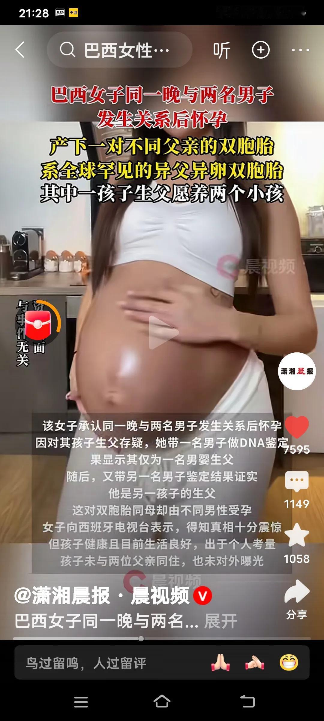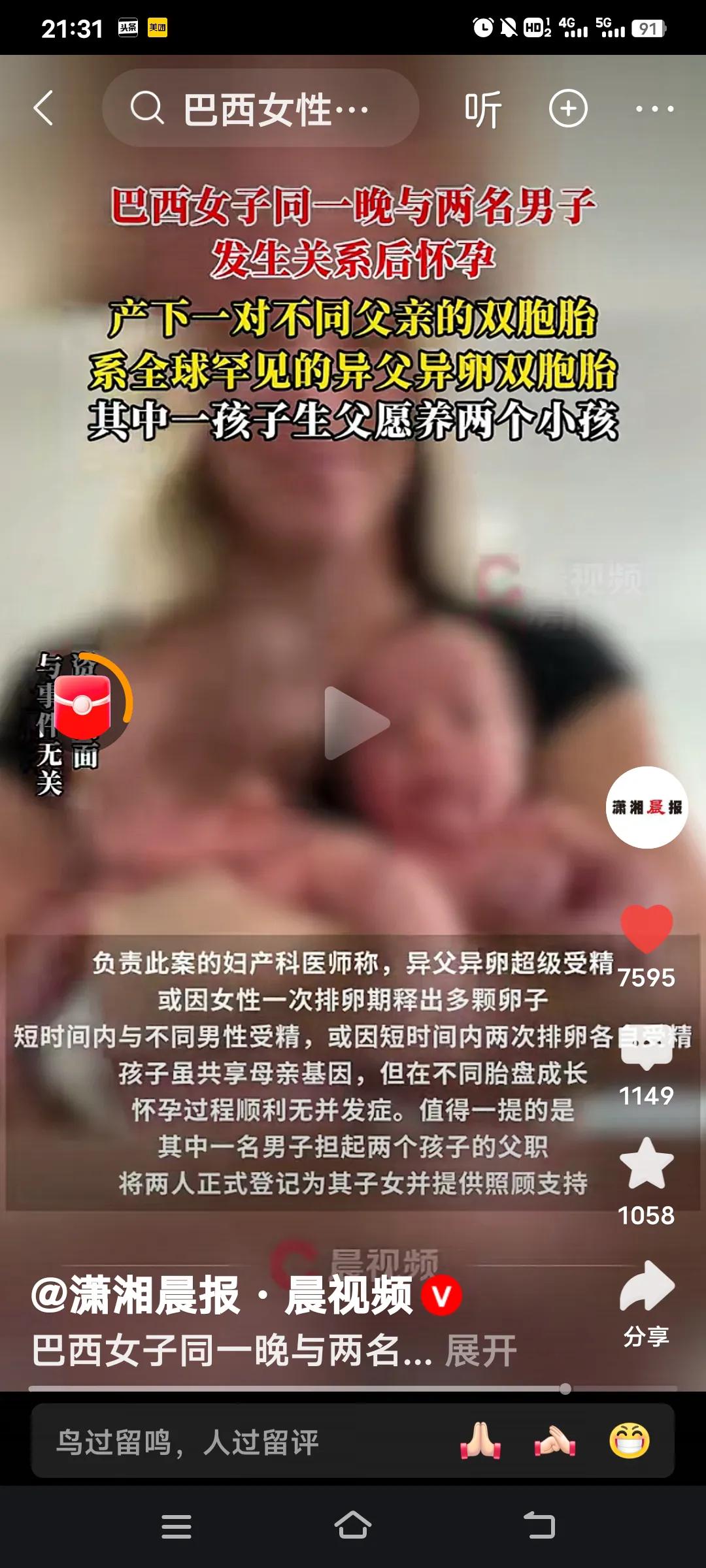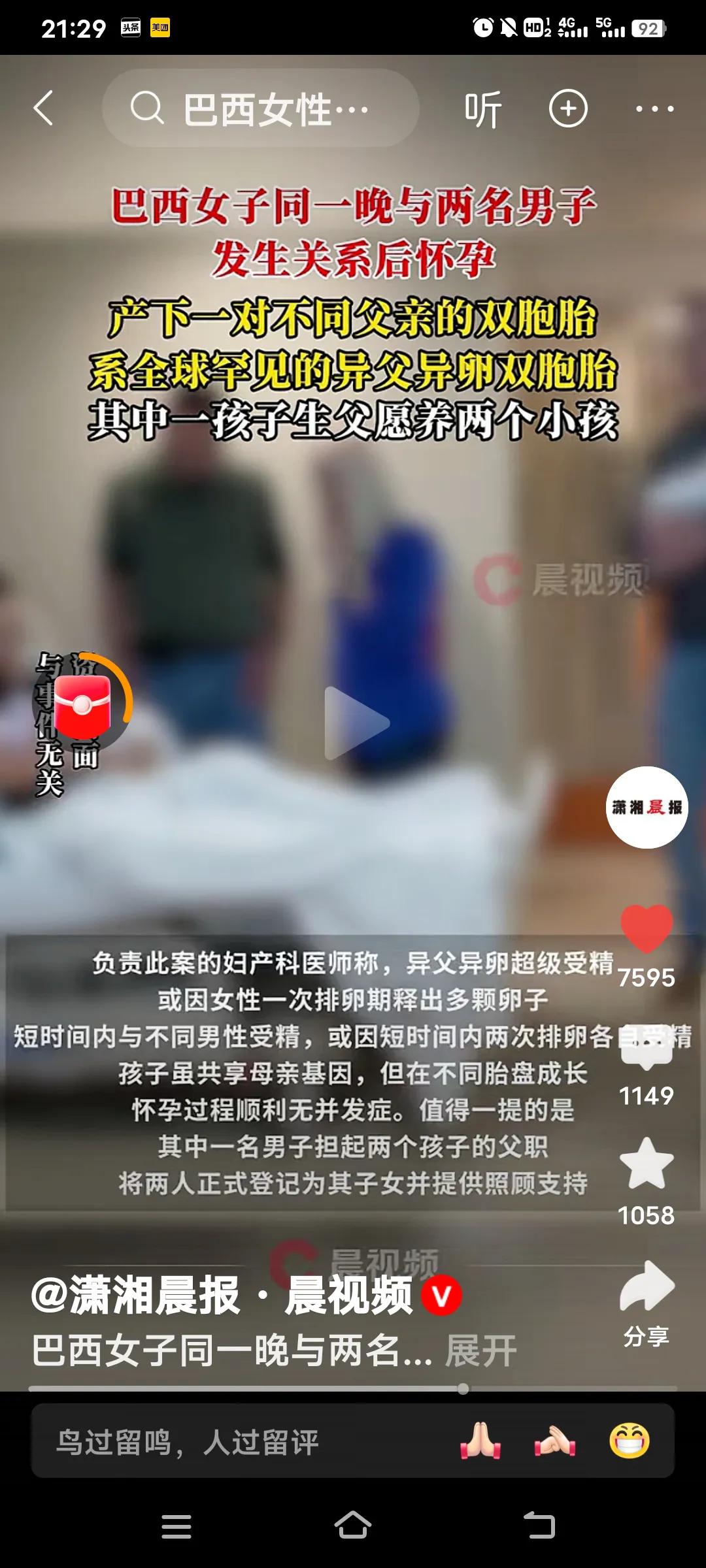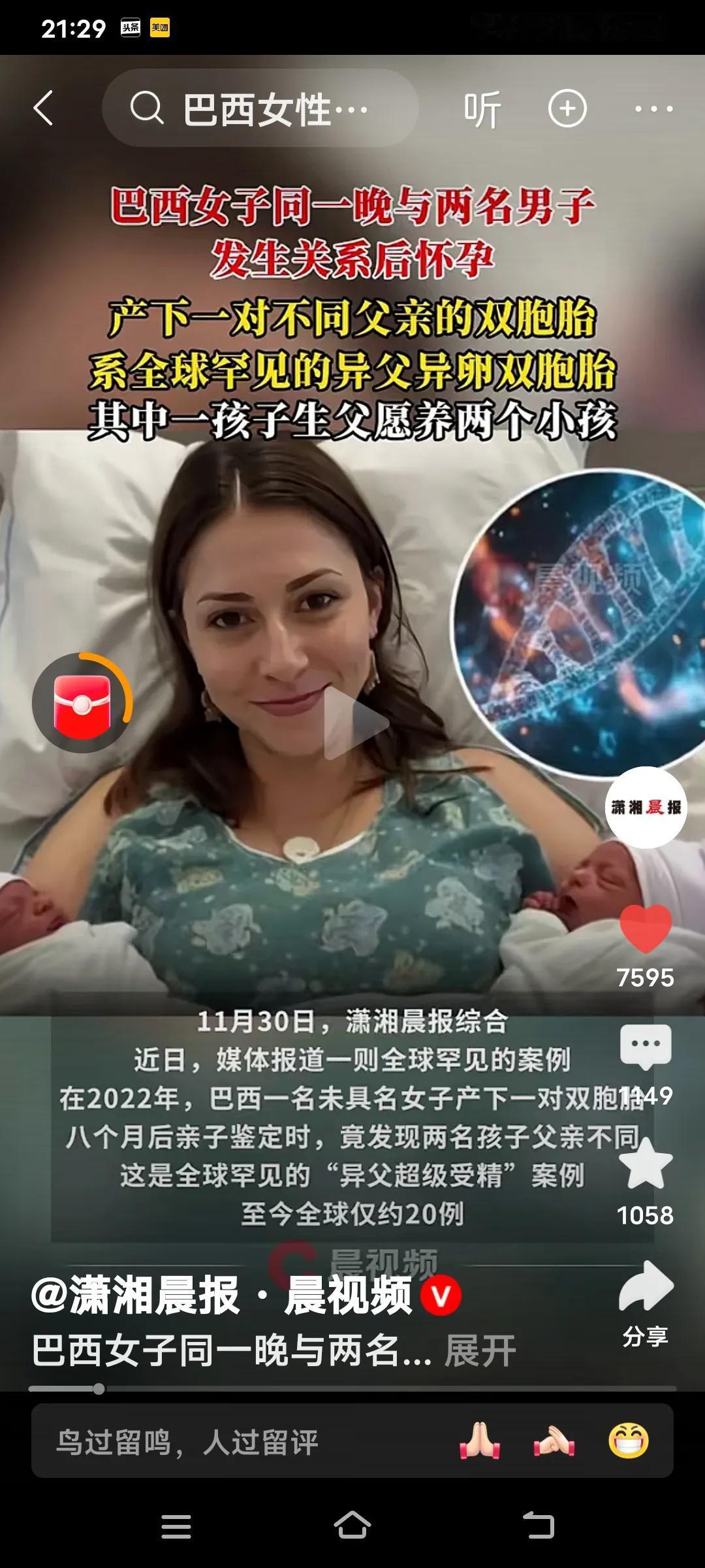 世界之大,无奇不有。2022 年巴西一名女子产下双胞胎,八个月后亲子鉴定发现俩孩子父亲不同,这是全球罕见的“异父异卵超受精”案例,全球仅约 20 例。该女子承认同一晚和两名男子发生关系后怀孕。 医生解释,可能是女性一次排卵期释出多颗卵子,短时间内与不同男性受精,或者短时间内两次排卵各自受精。以往土耳其、美国、巴西其他地区也有类似事件,2018 年巴西那例还导致夫妻离婚。而这次有一名男子担起两个孩子的父职,并与女子登记,为其子女提供照顾支持。 通过这件事情给有这女性提了个醒,男女交朋友需要珍惜,还好有个男的承担责任,不然一个女人带两个孩子真够呛的!双胞胎产妇 人类双胞胎