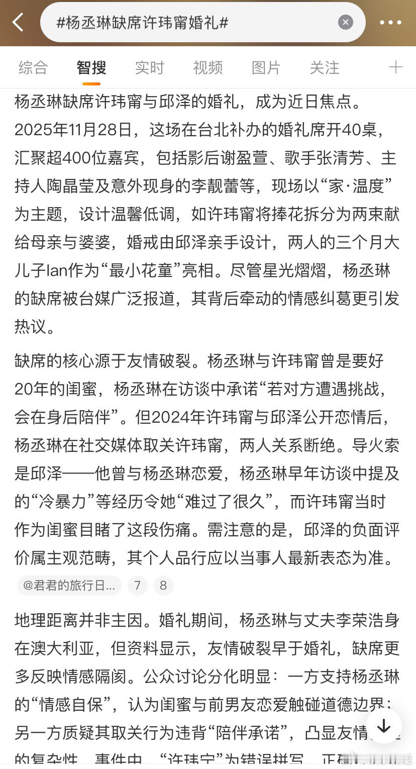 杨丞琳缺席许玮甯婚礼台媒报道杨丞琳缺席许玮甯婚礼。这没啥吧,粉丝表示杨丞琳有别的行程安排。不管怎么样,祝福邱泽许玮甯!
