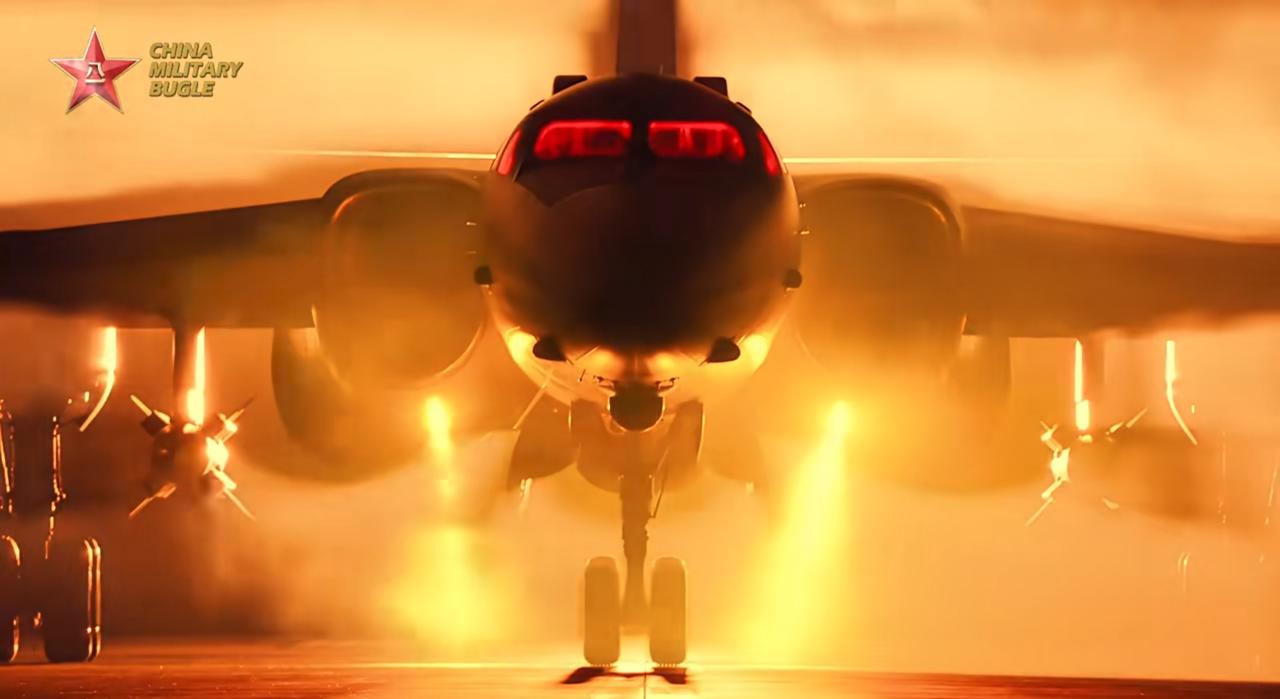 【眼中燃起怒火的轰-6!】 图片来自中国军号海外账号发布视频“Training with patience and passion…”截图,火红背景色衬托了战略轰炸机轰-6的盛怒! 战略轰炸机轰6