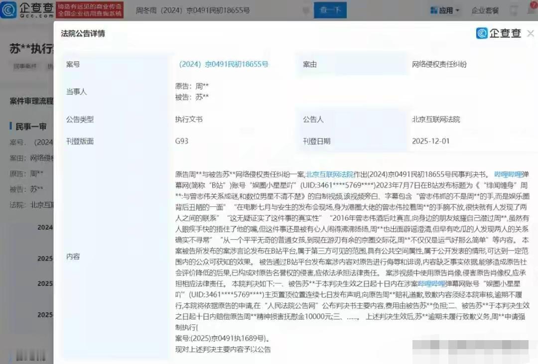 周冬雨动真格了!因网友造谣其与曾志伟关系,她起诉维权获赔1万。法院判令造谣者公开道歉,但对方迟迟未履行,周冬雨已申请强制执行。 这事儿提醒大家:网络不是法外之地,随口一句谣言可能就要付出真金白银的代价。从“静秋”到三金影后,周冬雨一路靠作品说话,没想到还得抽空收拾造谣者。支持依法维权,让键盘侠们知道:乱说话,是真的要赔钱的!