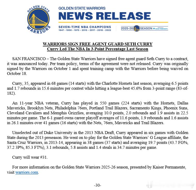 正式官宣!!勇士签约赛斯·库里,将披3️⃣1️⃣号球衣!!!