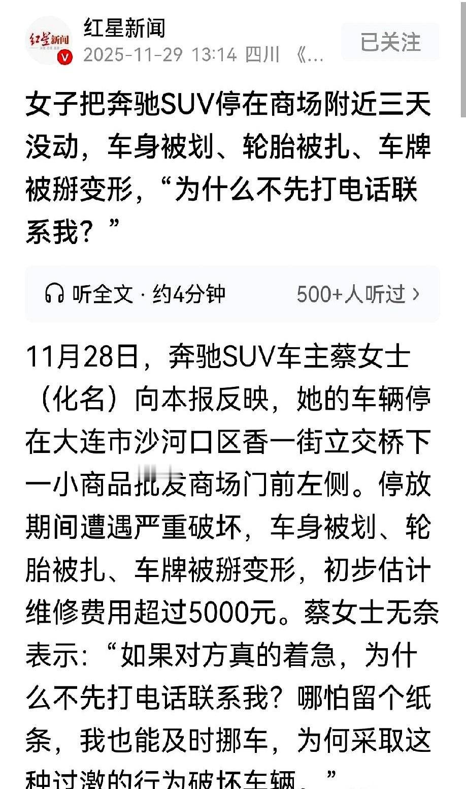 一辆大奔,堵在人家小商品批发店门口,堵了整整三天。 你品品那个老板的心情。 本来实体生意就难,门口给你停个“铁棺材”,客人进不来,财路断三天,换你你啥感觉? 车主说,我身体不舒服啊,我留电话了啊。 是,你留电话了。交警也给你打电话了,你还是没动。 说白了,你那个电话,不是给别人方便的,是让别人来“求”你的。姿态高得很。 身体不舒服?谁还没个头疼脑热的。你的不舒服,比别人的饭碗还重要?现在叫个代驾挪车,比点外卖还快。 别跟我扯什么法律。这事儿压根就不是法律问题,是人情世故。 车牌被掰弯,车身划得深见底漆,轮胎里扎着四棱钉…… 这手段是挺狠的,怨气也是真的。这是把你三天堵门的绝望,一次性全还给你了。 你心疼你那五千块的修车钱,觉得天都塌了。 那你有没有想过,这三天,人家店主损失的可能不止一个五千块? 做人留一线,日后好相见。 你把别人的路堵死了,就别怪别人用自己的方式,给你开一扇“天窗”。