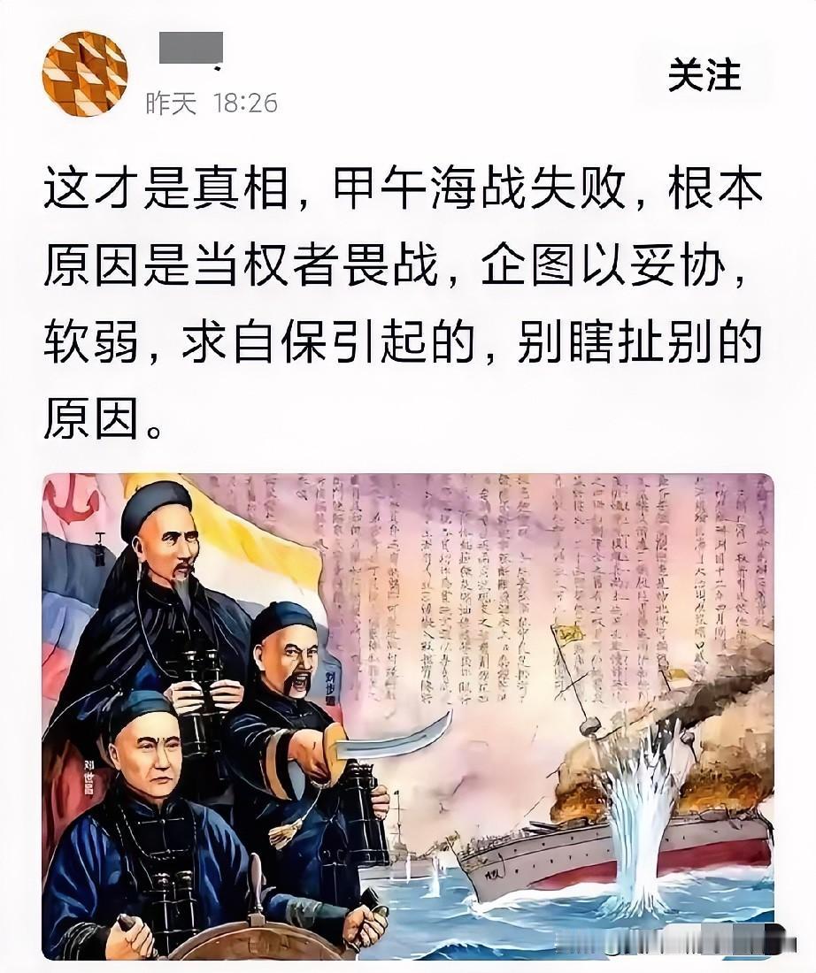 甲午战争,清政府为什么会失败? 主要是因为晚清政府,就像一只破船, 遇到了一个不称职的船长, 和一帮子不懂航行知识的水手, 驾驶着四处漏水的破船。 航行在滔天巨浪的大海上,没有一点抗风险的能力。 稍微来一个大浪,不翻船才怪!