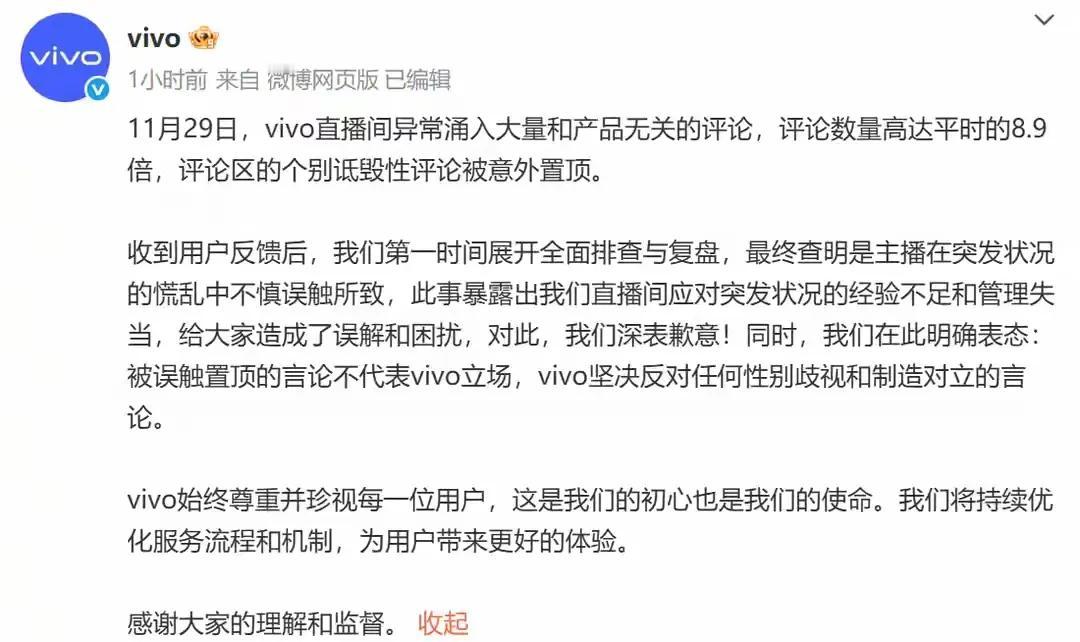 啥意思?挺深奥呀,是不是真相了?vivo直播间异常涌入大量和产品无关的评论,评论数量高达平时的8.9倍,评论区的个别诋毁性评论被意外置顶。