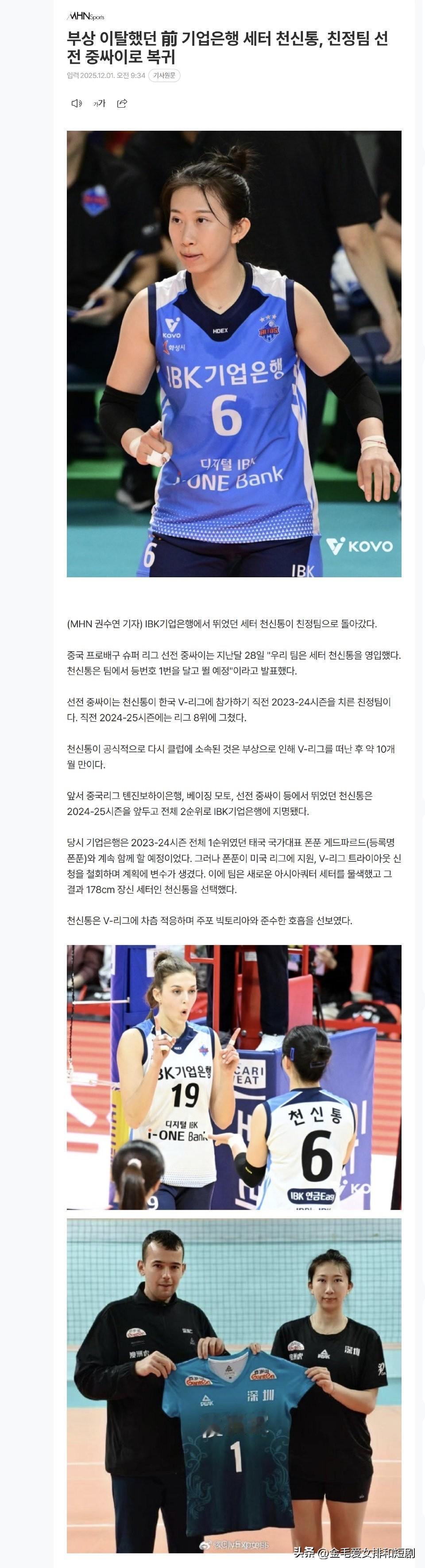 陈馨彤加盟广东深圳中塞女排,重返老东家一事,韩国媒体也进行了报道,而且篇幅不小。