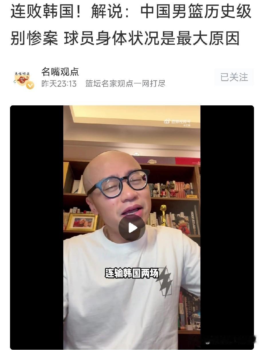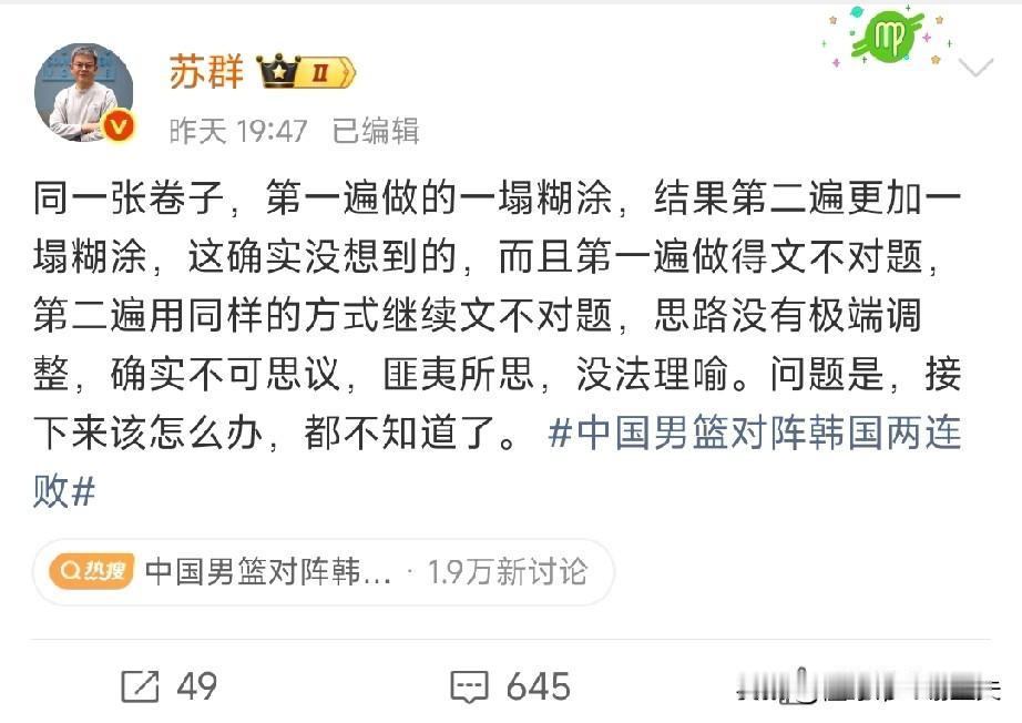 篮球名嘴苏群:男篮同一张卷子,第二遍更加一塌糊涂!王猛直言不讳:男篮输韩国是历史级别惨案 ;胡明轩的问题之前我就说过,他控运节奏不协调,不像是一个控卫,他的突破基本上没变化,埋着头往里面冲,男篮打成这样和全运会本身没关系,突然想起一句话,无辽不成军,可是当下这一届中国男篮没有辽宁队球员,只有三个辽宁籍球员,唯一入选王岚嵚被dnp
