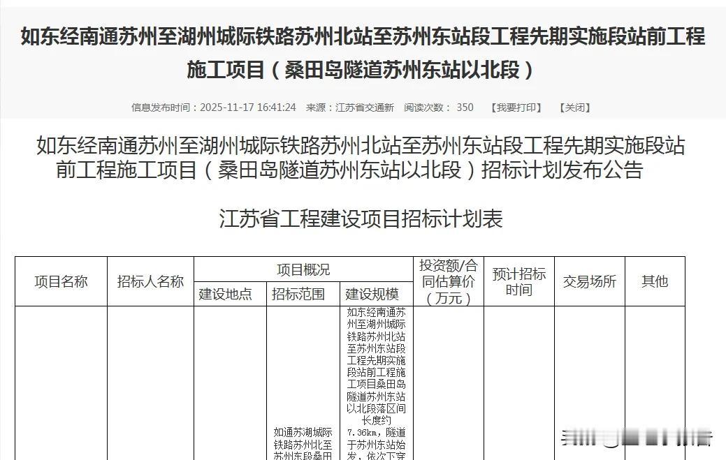 长三角又一条跨省城际铁路通道来了! 近日,苏州市交通运输局发布了如东经南通苏州至湖州城际铁路苏州北至苏州东站之间长度约34千米的线路施工社会风险公示。 这条线路就是规划中提及的如通苏湖铁路,铁路等级为城际铁路,设计时速160千米每小时,采用市域C级列车承运,轨距标准与沪宁城际铁路一致,可以作为沪宁城际铁路与苏锡常都市快线的联络线。 如通苏湖铁路沿线设置站点众多,毕竟是采取类似于市域S线运营,建成后将实现通苏湖同城化。如通苏湖铁路通过崇启长江隧道过江,可以与苏锡常都市圈快线太仓段实现互联,进而将南通带入上海轨道交通网络。如通苏湖铁路 长三角 南通 苏州 (图片引用自网络)