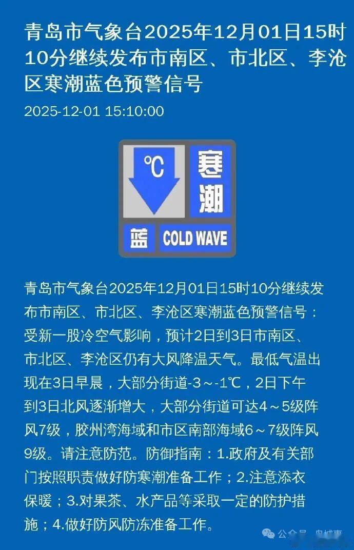 青岛市气象台继续发布市南区、市北区、李沧区寒潮蓝色预警信号