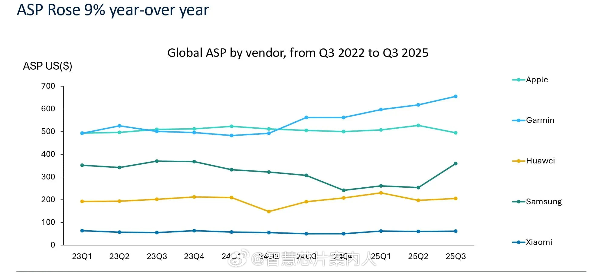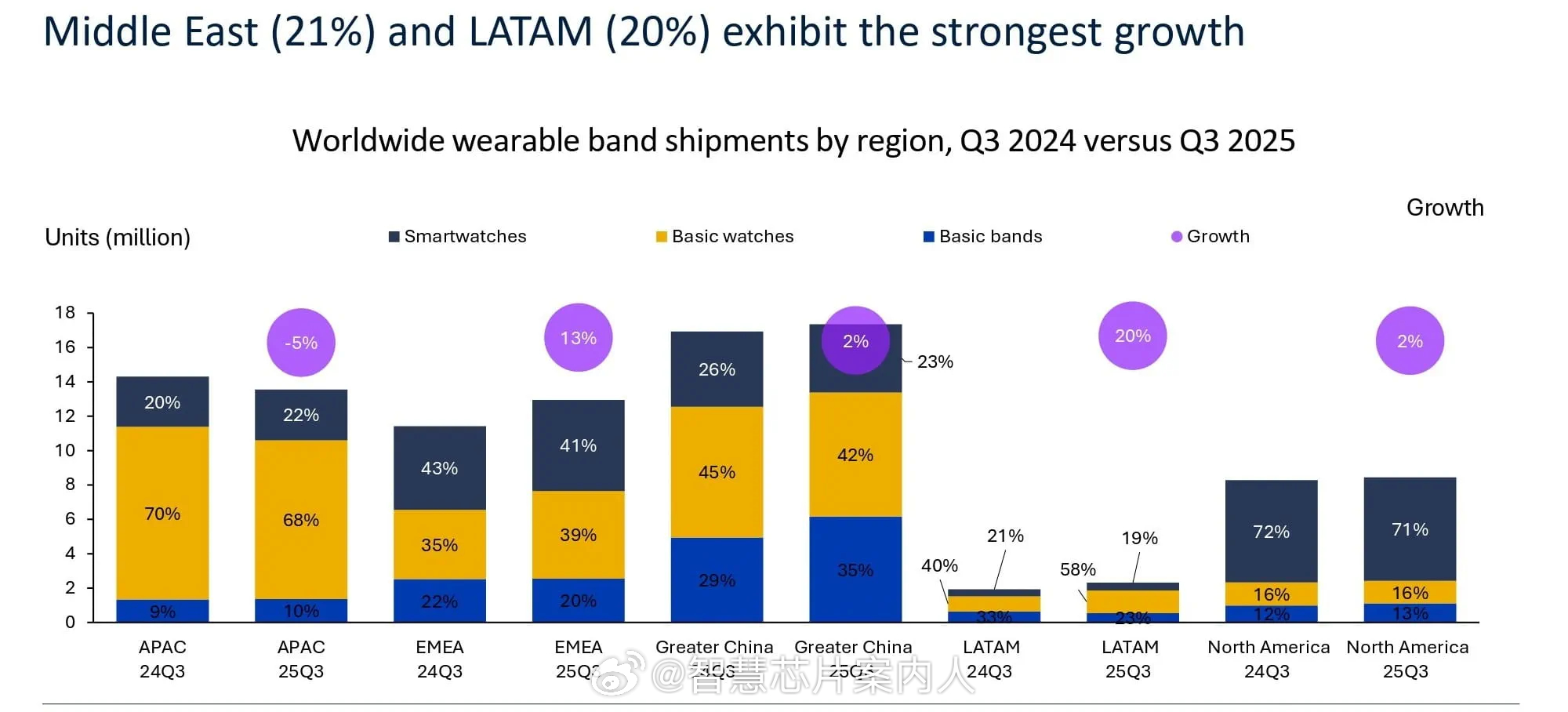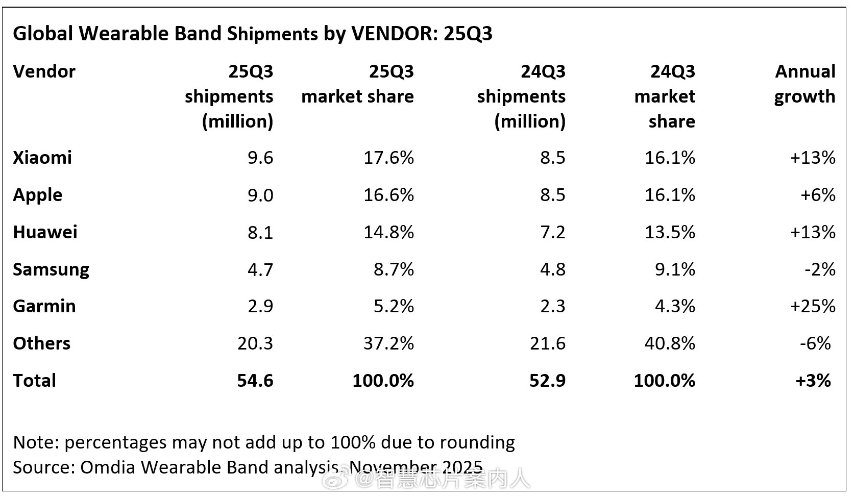 Omidia数据,全球可穿戴腕带市场25Q3出货增长3%,达到5460万部。中东和拉美同比增长21%和20%,成为主要的推动力。产品均价(ASP)也有9%的同步增长,实现了量价齐升。厂商出货,小米这次冲到了第一,市场份额达到17.6%。第一阵营三家厂商和后面的厂商拉开了明显的差距。