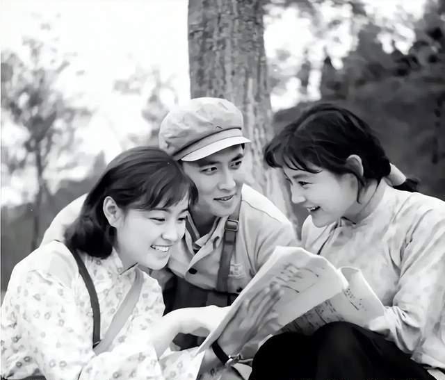 这张黑白照,我一眼就认出了捧着剧本、笑若暖阳的刘晓庆与戴着帽子、帅气逼人的唐国强,那位柔发覆额、清雅秀丽的长辫女星是谁?