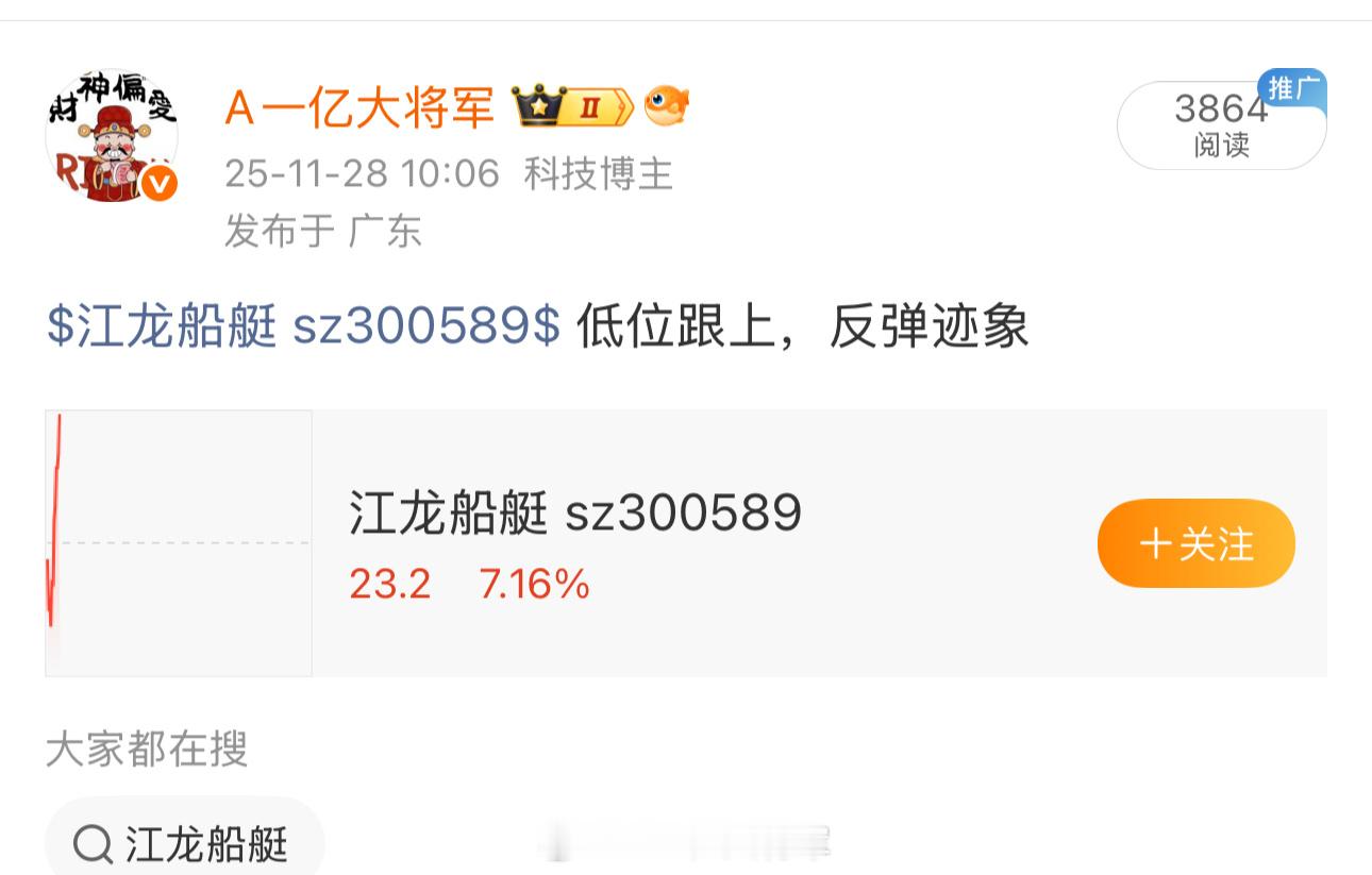 漂亮$江龙船艇 sz300589$ 拉升7个点,低吸的朋友获利5个点