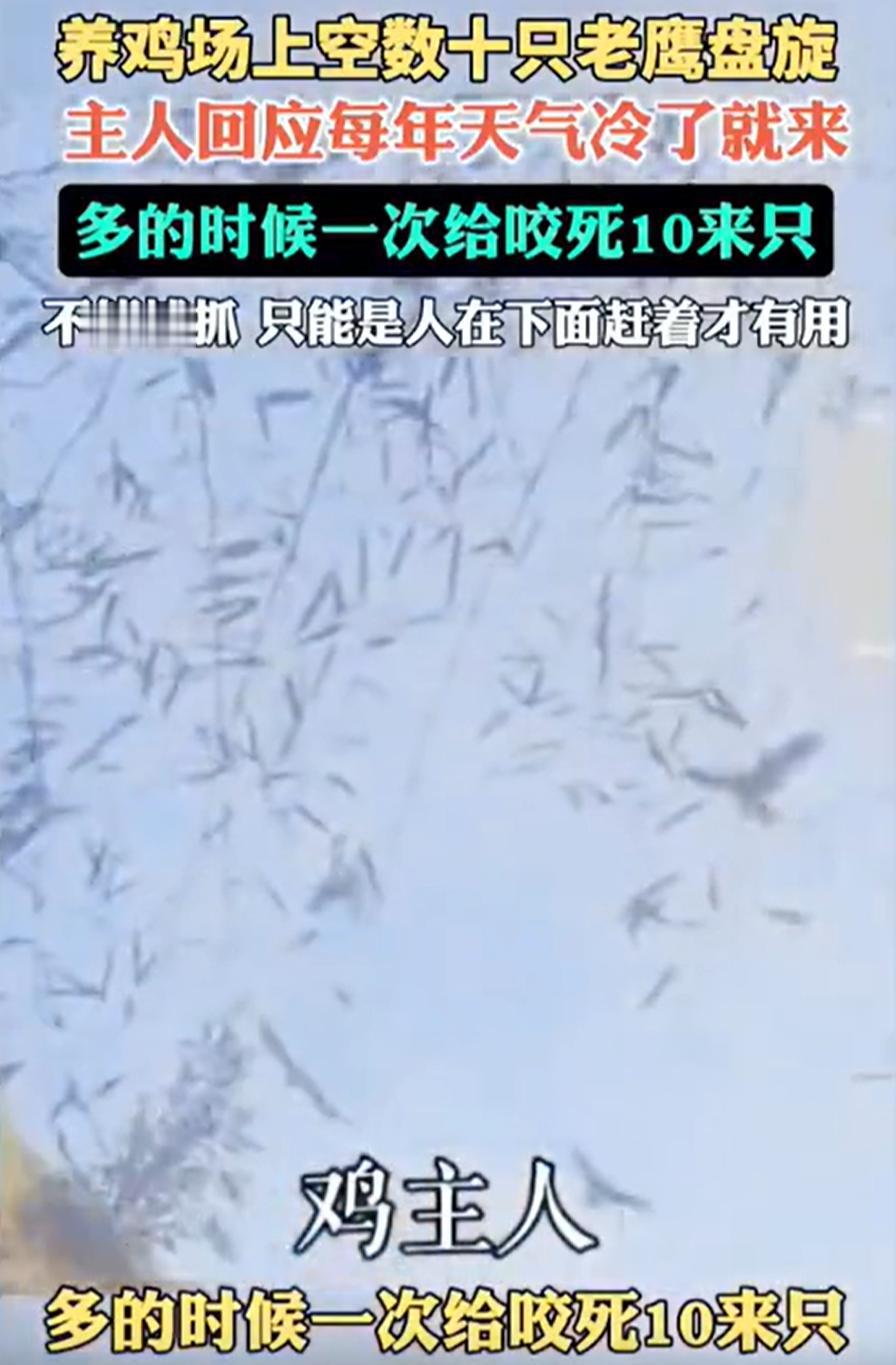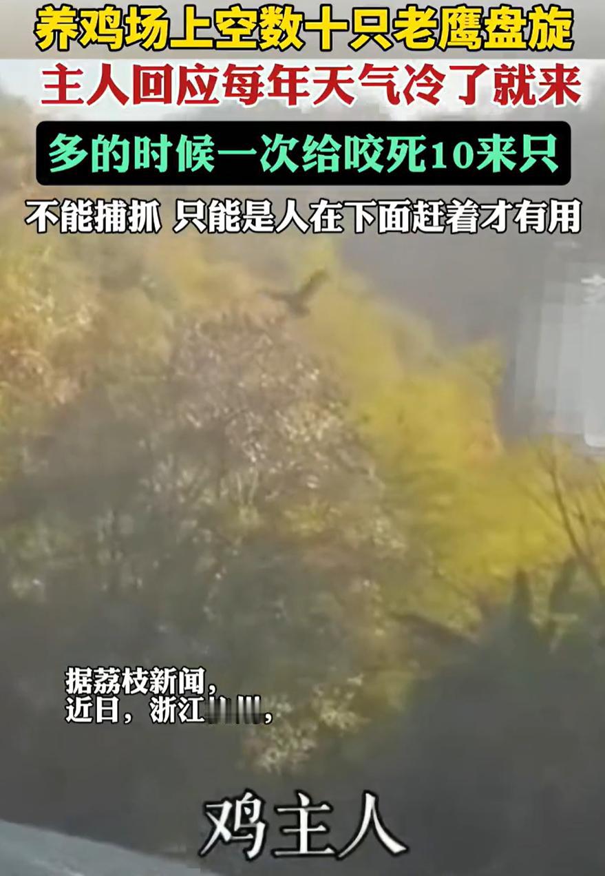 “这可如何是好!”浙江杭州,一男子在山里面弄了个养鸡场,可每年一到这个时候就相当困扰,天上总是飞来数十只老鹰,就等着拿小鸡“加餐”,可打又打不了,赶又赶不走,男子只能在网上进行求助 视频显示,在鸡场上方,数十只鹰在空中盘着圈,像是开了个早会,下面哪只小鸡跑得慢一点,都可能被它们盯上。鸡群一听到翅膀扑腾声就开始炸窝,东跑西躲,跟打散了一样。鸡主人也是一听到动静就得往外冲 鸡场主人介绍,在山里搞了个散养鸡场,原本想着山风干净,鸡长得结实,味道也好,但一到冬天天气一冷,这些老鹰就会过来觅食,最多的一次被咬死十来只,心疼的不行 说起来,这个事也确实让人困扰,要知道老鹰是国家二级保护动物,而小鸡属于家禽不算保护动物,这么一对比,养鸡户确实很难办,只能防护,不能主动出击 其实类似的困扰不少地方都有,不只是老鹰,有些地方野猪、麻雀也会给农户造成损失。完全靠人防不现实,还得想一些巧办法 比如,有的养殖户会在鸡场上方搭细网,不影响光照,但能防住俯冲;有的会养几只大鹅,鹅警惕性高、叫声大,能吓退不少天敌;也有人尝试在场地周边布置一些反光带、风车之类的东西,用视觉和声音干扰老鹰 但这些方法不一定都管用,尤其老鹰聪明,习惯了可能就不怕了。长远来看,或许需要更系统的应对方式——比如能不能通过当地林业部门备案,在损失确实发生时申请一定的补偿或援助?或者有没有可能联合几家养殖户,一起请专业人士来设计防护方案? 对此,你怎么看?
