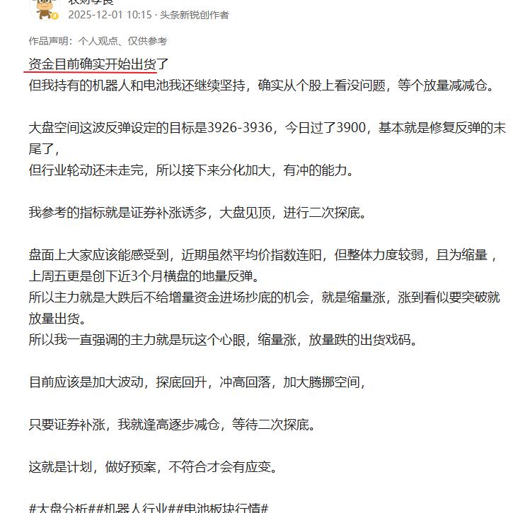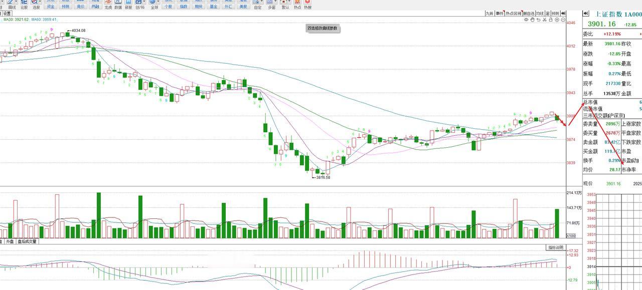 不用担心,30分钟级别还有新高 昨日增量,不少资金开始出货了,主力的老把戏, 目前还未到拐头直接向下的地步。但主力一旦出了大部分货,就会迎来标志性的普跌大跌。 目前继续反弹目标3926-3936 从昨天开始个股已经不同程度的出货 基本就是冲高回落,探底回升。 多来几个来回,主力就完成了出货。 所以大家看手中的个股,有了好的价格要逐渐高抛,控制好仓位,等待回踩。 时间不多,周四之前 不同股票周期不一样,并不是会要到最后才走, 有的昨日就是高点,有点可能未来2天才见高点。 指数今日受美股下跌先向下,那后续还会有30分钟级别的高点。 目前 持有电池+人形机器人还未减仓,后续择机减仓。