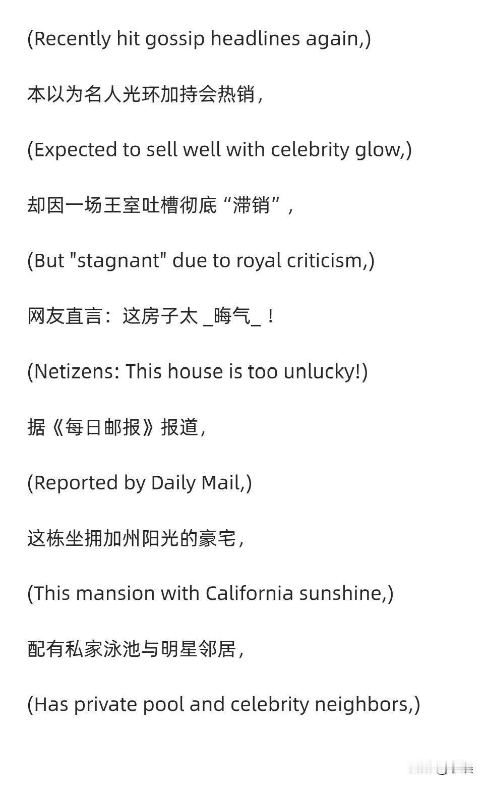 梅根和哈里吐槽王室豪宅,降价三百多万没人。。 她的配得感真是高!她觉得自己应该当这个世界的女王?![吃瓜群众] 查了一下入价不到1500万。。。5年可以翻一倍了吗?! 和他们也没啥关系吧,主要是价格,毕竟 硅谷杀妻案 的房子都卖出去了?![吃瓜群众]梅根 哈里·梅根