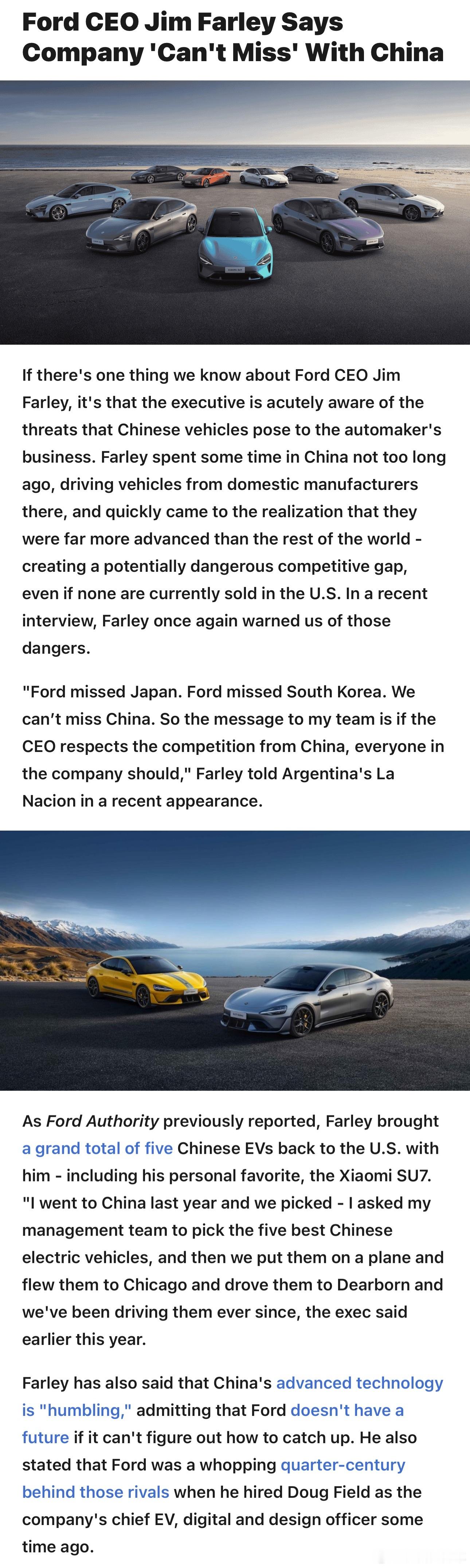 福特 CEO | 吉姆·法利:“福特错过了日本,也错过了韩国。我们不能再错过中国,所以我给团队的讯息是,如果连 CEO 都尊重来自中国的竞争,那么公司里的每一个人都应该如此。”新能源汽车福特