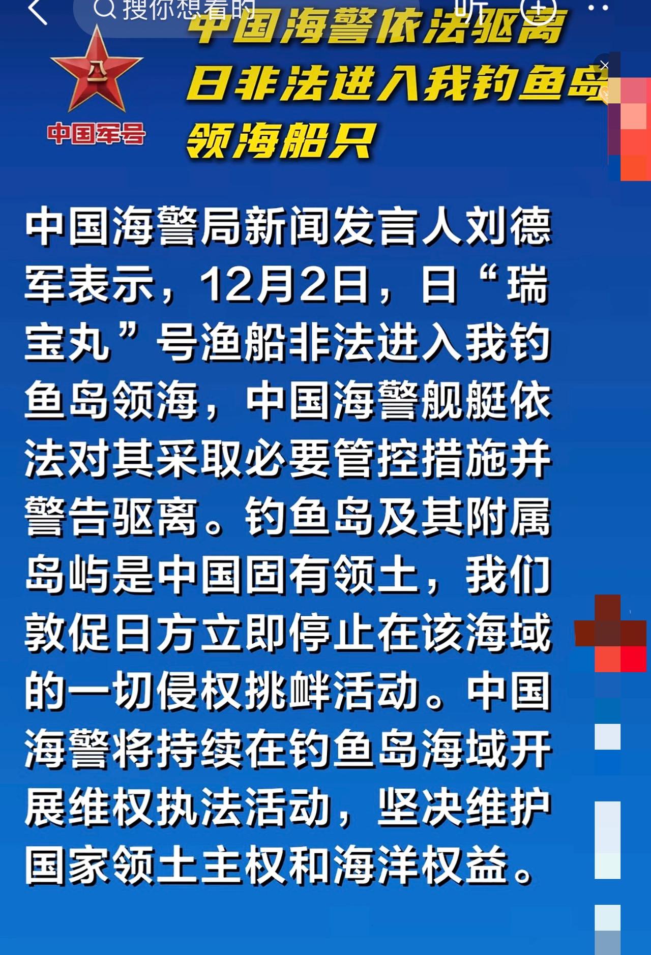 12月2日,日“瑞宝丸”号渔船非法闯入我国钓鱼岛领海,真不知道日本这是打的什么算盘。不过咱中国海警可不含糊,舰艇迅速出动,依法对其采取必要管控措施,还果断警告驱离。 钓鱼岛及其附属岛屿本就是中国的固有领土,这是板上钉钉的事。日本这种侵权挑衅活动,就是在自讨没趣。咱中国海警可不是吃素的,会持续在钓鱼岛海域开展维权执法活动。奉劝日方早点收手,别再做这种吃力不讨好的事,不然只会碰一鼻子灰。 日本近年来不断在钓鱼岛问题上小动作频出,其背后是妄图通过这种非法的、无理的挑衅,来试探我国的底线。但他们打错了算盘,中国维护国家主权和领土完整的决心坚如磐石,绝不会被这种小把戏所影响。 回顾历史,钓鱼岛及其附属岛屿的主权归属有着清晰的脉络。从明朝开始,钓鱼岛就已在中国海防管辖范围之内。无论从历史依据,还是国际法理来看,钓鱼岛都毫无疑问属于中国。日本的这些侵权行为,不过是对历史事实的公然无视和肆意践踏。 随着科技的发展,先进的执法装备和高效的指挥体系将为维护国家海洋权益提供更坚实的保障。我们也有理由相信,面对日本可能出现的新挑衅,中国海警定能凭借过硬的专业素养和坚定的意志,坚决捍卫我国的海洋领土安全。