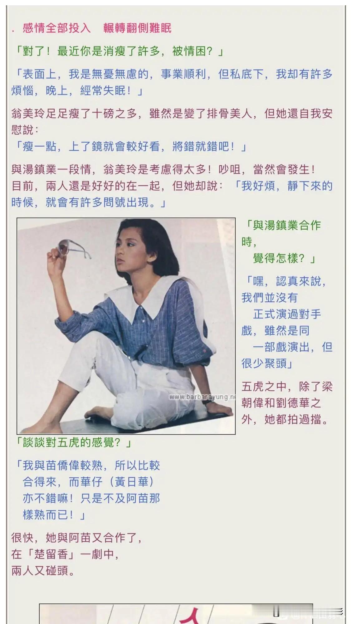 翁美玲旧刊报道📄 报道了里说阿翁瘦了十磅 自嘲“排骨美人” 笑着说“瘦点上镜好看” 可眼底藏不住的,是深夜失眠的烦忧 和汤镇业的情,是她心头的结 吵过闹过,人还在一起 静下来时,满是问号在翻涌 谈起五虎 说和苗侨伟最合得来 黄日华也不错,只是没那么熟 很快又要和阿苗在《楚留香》里碰头 镜头里的她眼里有光 私下的她,藏着少女的心事分享你最喜欢的明星吧 有谁还记得翁美玲 你最喜欢哪个女明星