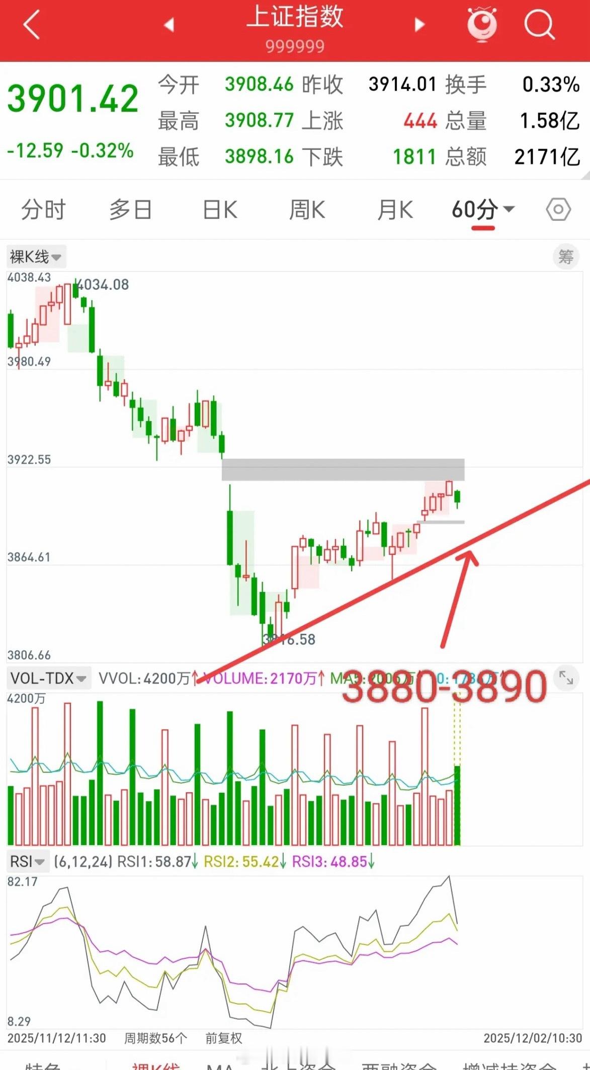 A股,今日缩量调整,后市该如何应对?缩量上涨还会涨,缩量下跌还会跌,目前大盘往下有支撑3880-3890左右,往上有压力3900-3930左右。大盘如果单从技术形态上来看,就属于破位后的反抽,反抽只要不站上颈线,在颈线压力附近需谨慎,这里不轻易做多。如果大盘前期没跌破平台支撑,像11.3/11.5号这种,属于突破前顶平台后的二次回踩,回踩只要不跌破前顶,机会大于风险,而当下是11.21号跌破前顶平台,因此属于破位后的反抽,反抽不过平台压力,风险大于机会。所以,轻指数,重个股,个股,也是找突破后的二次回踩,回踩不破前顶平台的为主!