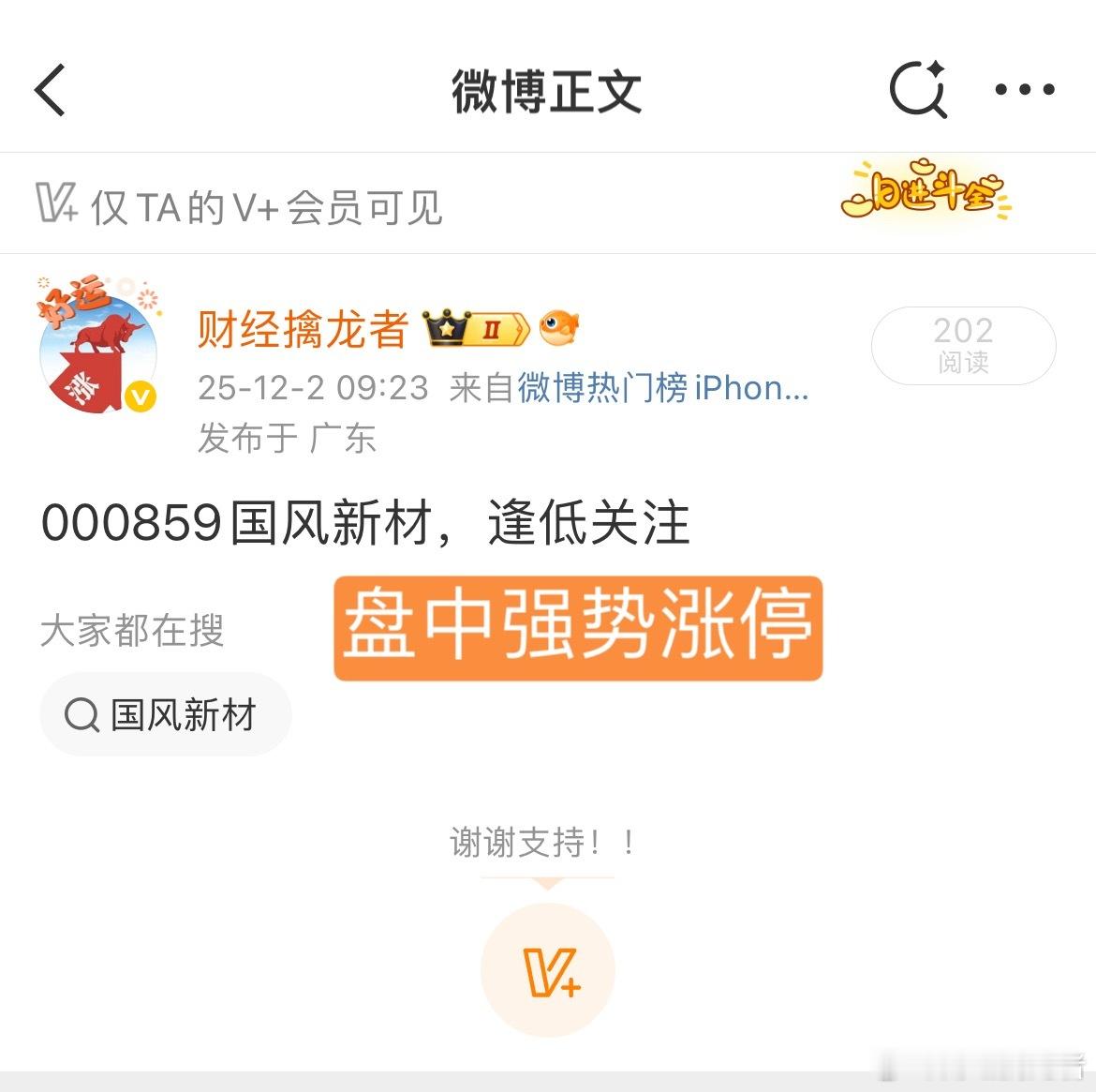 捷报!V+订阅专属标的国风新材强势涨停,跟上节奏就是赚!早盘布局的V+专属标的——国风新材,今日盘中强势拉升封死涨停!恭喜跟上操作的友友们,精准把握主线节奏,坐享涨停红利!国风新材的逆势走强绝非偶然:一方面,公司核心业务贴合当下市场热门的新材料赛道,基本面具备业绩修复与估值提升双重逻辑;另一方面,早盘资金提前抢筹迹象明显,量能配合完美,为午后的涨停奠定了坚实基础。我们始终聚焦市场主线方向,深挖具备资金共振、基本面支撑的潜力标的,为V+订阅提供精准的布局参考。后续我们仍将紧盯盘面变化,持续筛选优质标的,让跟上节奏的友友们稳稳把握A股红利!【风险提示】本文仅为市场操作分享,不构成投资建议,股市有风险,投资需谨慎。今日看盘上证指数a股