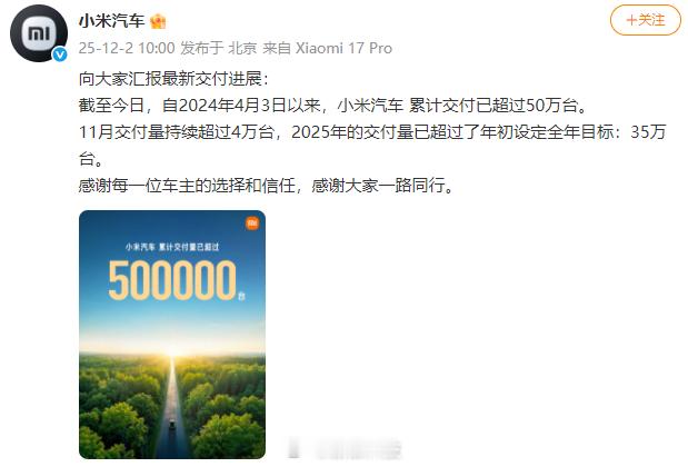 【小米汽车完成全年交付目标小米汽车今年已交付超35万台】宣布,11月交付量持续超过4万台,2025年的交付量已超过了年初设定全年目标:35万台。 小米汽车最新交付进展