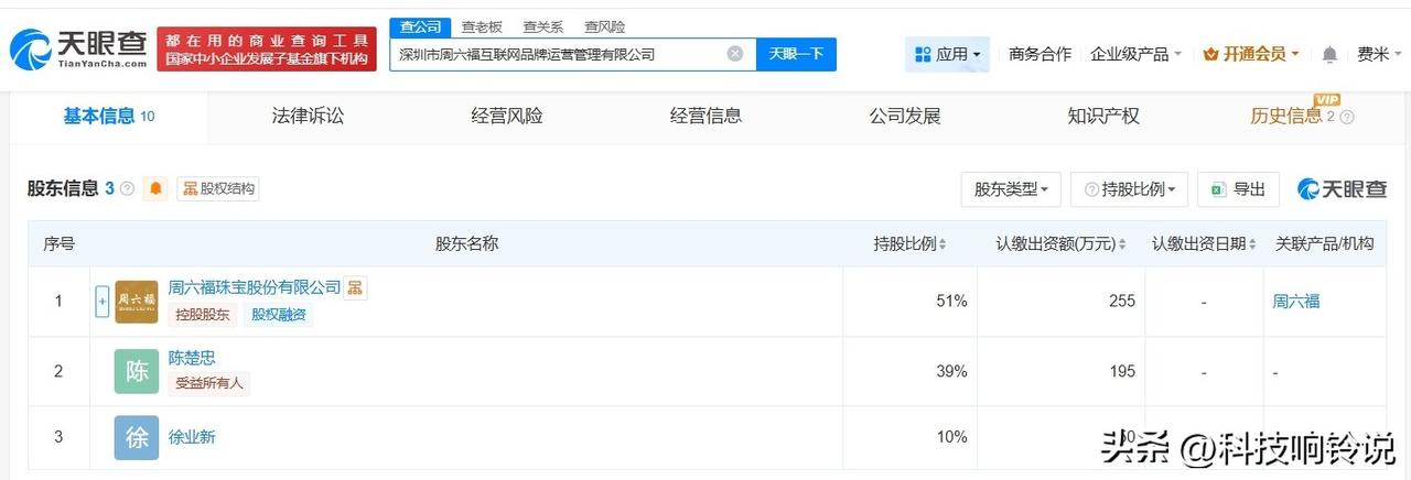 【周六福等在深圳成立互联网品牌运营管理公司 注册资本500万】 天眼查工商信息显示,近日,深圳市周六福互联网品牌运营管理有限公司成立,法定代表人为李伟蓬,注册资本500万人民币,经营范围包括珠宝首饰批发、珠宝首饰制造、珠宝首饰零售、珠宝首饰回收修理服务等。股东信息显示,该公司由周六福珠宝股份有限公司、陈楚忠、徐业新共同持股。 天眼查信息: