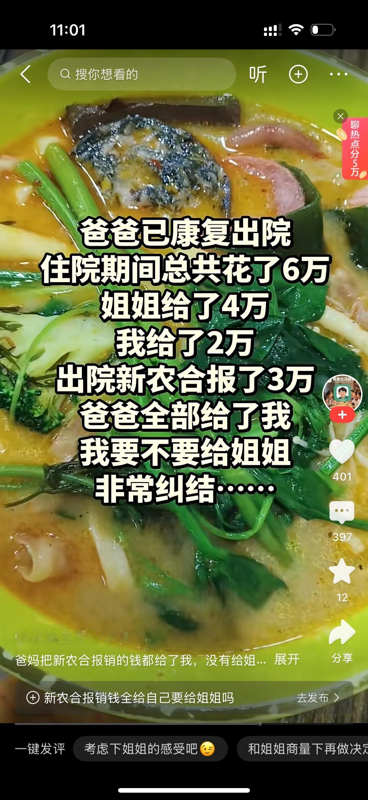 爸爸已康复出院。住院期间总共花了6万,姐姐给了4万,弟弟给了2万。出院新农合报了3万,爸爸全给了弟弟,还叮嘱弟弟不要告诉姐姐。弟弟问为什么?父亲说,你才是我们家的血脉。你姐姐嫁出去的女儿,就是泼出去的水。她再好也是外人。你好才是我们家族的希望。弟弟听了爸爸这番话,心里不是滋味,他纠结这个钱到底要不要给姐姐。