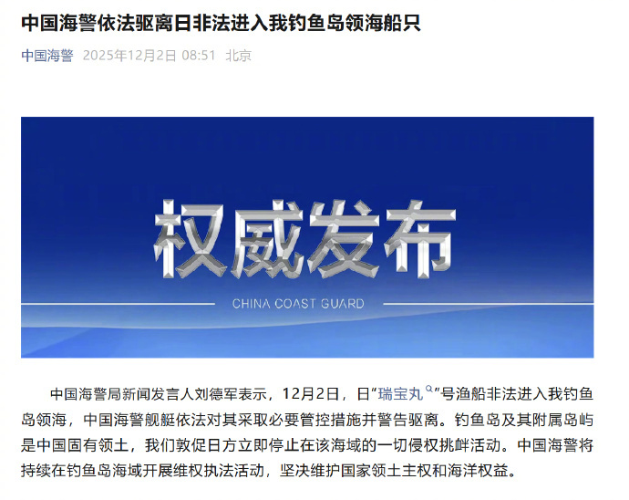 #日非法进入我钓鱼岛领海船只被驱离#【中国海警依法驱离日非法进入我钓鱼岛领海船只】中国海警局新闻发言人刘德军表示,12月2日,日“瑞宝丸”号渔船非法进入我钓鱼岛领海,中国海警舰艇依法对其采取必要管控措施并警告驱离。钓鱼岛及其附属岛屿是中国固有领土,我们敦促日方立即停止在该海域的一切侵权挑衅活动。中国海警将持续在钓鱼岛海域开展维权执法活动,坚决维护国家领土主权和海洋权益。(新华社 中国海警)#中国海警依法警告驱离日本船只#