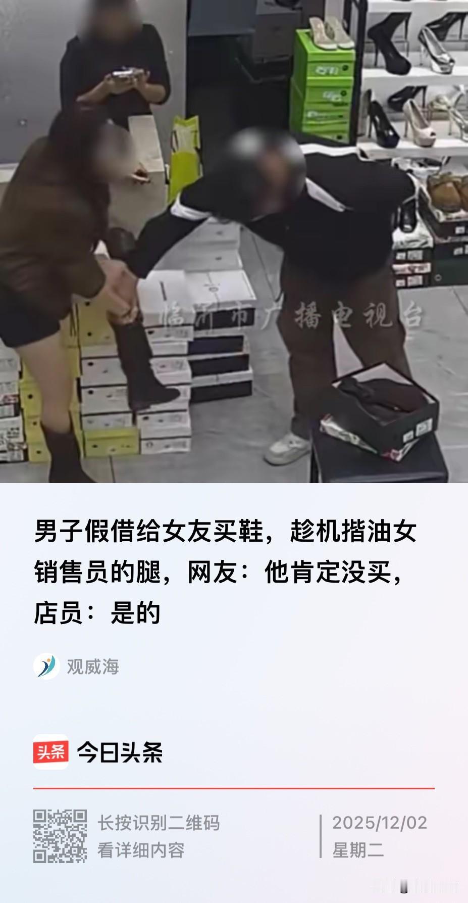 广东,一男子来到一家女装店打算给女友买双鞋,因为女友没来,所以男子希望店员穿上看看效果,女店员于是便穿上了鞋子后展示给男子,男子一边看一边伸手触碰鞋子,看看是否合适,结果却碰到了女店员的腿,女店员大呼,你不要摸我。 视频中,女店员穿着一双鞋子展示给这名男子看,男子一边看,一边伸手触碰鞋子,似乎是在看鞋子是否合脚,可是,趁着店员不注意,男子直接用手心摸了女子小腿一下。 女店员大呼,你不要摸我腿。男子则假意称,我要看看和腿部的空间。最后,这名男子并没有购买这双鞋子。 事发后,网友表示,腿又不是隐私部位,没必要大惊小怪的。 也有网友表示,这个男的肯定是老手了,不然不会这么淡定,所以,女店员要及时报警处理。 其实,男子触碰女店员的腿部,虽然腿部的位置不是隐私部位,但是,这是他人的身体一部分,未经他人允许,是不得擅自触碰的。 男子的行为,说白了就是趁机揩油,一般情况会受到治安处罚,构不上犯罪,对于男子的行为,根据治安管理处罚法第44条,猥亵他人的,或者在公共场所故意裸露身体,情节恶劣的,处5日以上10日以下拘留。 所以,如果女店员选择报警,那么,这名男子可能要被处以行政拘留处罚。 当然,毕竟男子触碰的是腿部,属于一般身体部位,如果最终男子的行为被认定为情节轻微,没有被执行行政拘留,也不意味着男子就没事了。 民法典第1010条规定,违背他人意愿,以言语、文字、图像、肢体行为等方式对他人实施性骚扰的,受害人有权依法请求行为人承担民事责任。 所以,男子的行为由于是一种性骚扰行为,那么,也将会面临民事赔偿等法律责任。 其实,店员穿衣服或者穿鞋子展示给顾客看,寄希望于顾客能够通过自己的展示下单成交,从而对一些顾客的过分行为予以容忍,殊不知,这样的行为反而让顾客变得更肆无忌惮,所以,一旦碰到类似的事情,还是要选择报警求助,不能忍气吞声,让这样的恶行继续蔓延。 对此,你对本案有什么看法? —————————— 关注我,带你评析法律热点,关注冷暖人生。 文章原创,抄袭必究