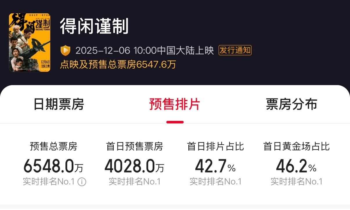 流量明星主演的电影预售票房感觉都能轻松破亿,《狂野时代》上映前就票房破亿了,《得闲谨制》当前预售票房也破了6500万,上映前大概率轻松破亿的。