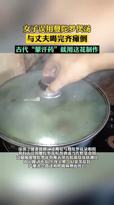 “悲剧还是发生了!”近日,广东深圳,一女子在市场上买中药煲汤喝,结果喝完15分钟后,夫妻俩就头晕、四肢无力,家人发现后急忙送去医院,经检查,二人是误服了曼陀罗花,所幸发现的及时,没有生命危险。网友:这不是蒙汗药吗! 在野外,经常能看到很多长相雷同的植物,不仔细分辨根本看不出来区别,也正因如此,遇到不认识的植物千万不要随便吃,因为有些有剧毒,一旦吃了后果不堪设想。 据媒体12月1日的报道,前几天,李阿姨见家中的“凌霄花”快用完了,就去市场上又买了些回来,随后煲了汤和丈夫一起滋补身体。 没想到二人喝完过了十来分钟的时间,就出现了头晕目眩、浑身乏力的症状,二人瘫倒在地,用微弱的声音喊救命。 儿子发现后立马将他们送去医院,经过检查,原来二人服用的“凌霄花”汤中,加入了有毒的“曼陀罗花”,这两种花长得差不多,但是一个有毒、一个没毒,二人这才出现了不适症状,幸亏就医及时,经过治疗很快就脱离了危险。 曼陀罗花在古代,被人制作成“蒙汗药”,服用过量的话甚至有生命危险,所以大家一定要擦亮双眼,千万别误服了。 信息来源:《女子煲汤给丈夫喝,15分钟后一起瘫倒,双双中了“情花毒”,疾控:误用曼陀罗花,古称“蒙汗药”。》荆楚网