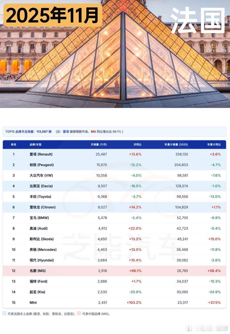 法国 11 月新车注册量同比微跌,累计销量仍呈下降态势。燃油车持续大幅下滑,纯电车型却同比激增,市场份额明显提升。品牌方面,雷诺稳居市占率第一,MG 等品牌增长突出,特斯拉则因车型切换等因素销量大幅下滑。车型端雷诺 Clio V 领跑,雷诺 5 凭借政策红利首次冲进前三~