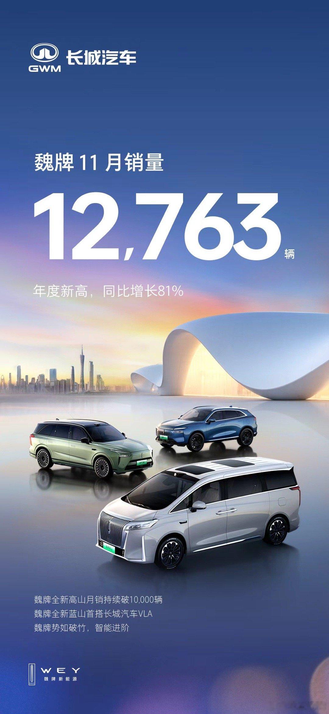 年度新高!魏牌11月销量12,763辆已5个月破万,同比增长81%,魏牌全新高山 连续两个月月销破10,000辆。魏牌全新蓝山 首搭长城汽车VLA,即将上市。感谢每一位用户与我们携手并进,魏牌向上,势不可挡!魏牌销量长城汽车VLA首搭魏牌蓝山 魏牌高山月销持续破万