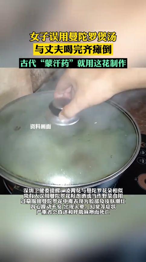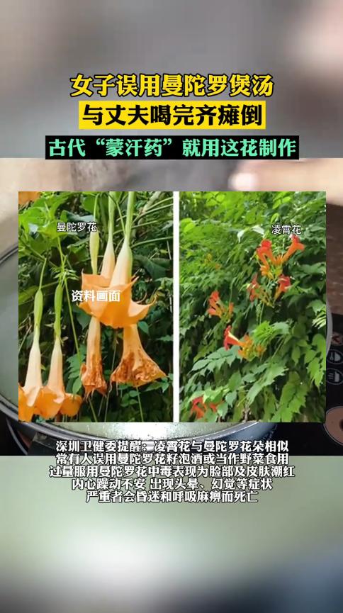 “悲剧还是发生了!”近日,广东深圳,一女子在市场上买中药煲汤喝,结果喝完15分钟后,夫妻俩就头晕、四肢无力,家人发现后急忙送去医院,经检查,二人是误服了曼陀罗花,所幸发现的及时,没有生命危险。网友:这不是蒙汗药吗! 在野外,经常能看到很多长相雷同的植物,不仔细分辨根本看不出来区别,也正因如此,遇到不认识的植物千万不要随便吃,因为有些有剧毒,一旦吃了后果不堪设想。 据媒体12月1日的报道,前几天,李阿姨见家中的“凌霄花”快用完了,就去市场上又买了些回来,随后煲了汤和丈夫一起滋补身体。 没想到二人喝完过了十来分钟的时间,就出现了头晕目眩、浑身乏力的症状,二人瘫倒在地,用微弱的声音喊救命。 儿子发现后立马将他们送去医院,经过检查,原来二人服用的“凌霄花”汤中,加入了有毒的“曼陀罗花”,这两种花长得差不多,但是一个有毒、一个没毒,二人这才出现了不适症状,幸亏就医及时,经过治疗很快就脱离了危险。 曼陀罗花在古代,被人制作成“蒙汗药”,服用过量的话甚至有生命危险,所以大家一定要擦亮双眼,千万别误服了。 信息来源:《女子煲汤给丈夫喝,15分钟后一起瘫倒,双双中了“情花毒”,疾控:误用曼陀罗花,古称“蒙汗药”。》荆楚网
