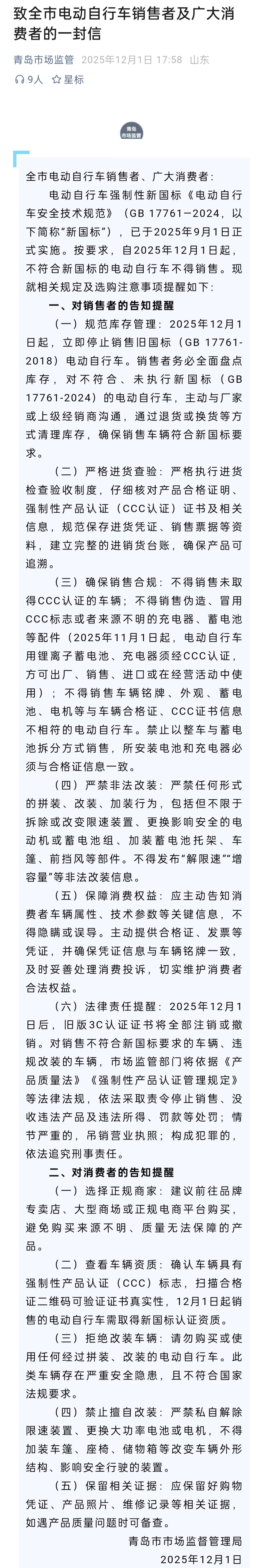 自2025年12月1日起,不符合新国标的电动自行车不得销售