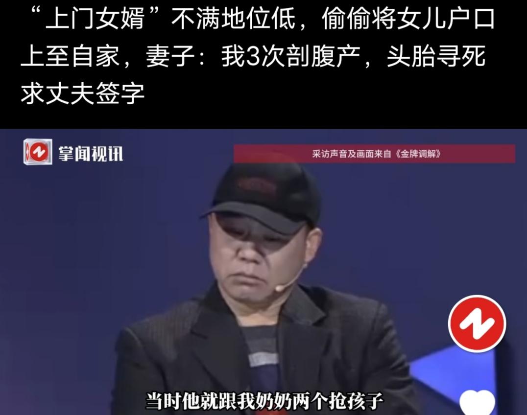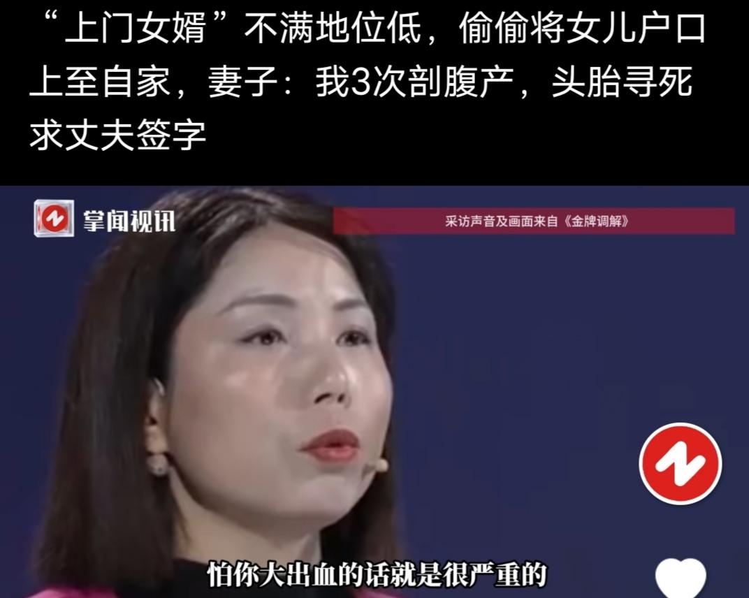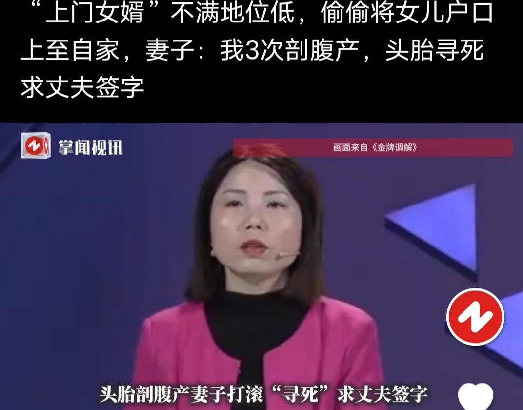 “上门女婿”不满地位低,偷偷将女儿户口上到自家,妻子说她三次剖腹产,头胎寻死求丈夫签字! 掌闻视讯看到的消息,两人闹到综合《金牌调解》上去了,这个当“上门女婿”的男子,因为长期不满自己身份、地位,擅自将女儿户口上至自家、争夺孩子抚养权,女子的奶奶就坚决不同意,两个人就吵架,抢孩子,奶奶抱着孩子上半身,这个当爹的抱着孩子的双腿,两人就使劲拽孩子,拉得孩子腿都咔咔响,女子听着都心疼害怕,拽坏孩子怎么办? 然后女子又说到自己头胎剖腹产,妻子打滚“寻死”求丈夫签字男人才签字的,而第三次剖腹产丈夫又以工作为由拒不回家! 首先,这当上门女婿,到现在都依然会被人讨论在婚姻中,会有弱势的地位处境,毕竟,有实力的男子大概都不会去做“出嫁”的一方,这种思想根深蒂固,也是社会现实,所以,难免被社会被家庭轻视。那么既然知道会有这样的结果,当初为什么要去做上门女婿?既然自己选择了,那就得履行好家庭幸福的本质,不要闹得家庭不睦。 第二,如今什么年代了,人都是自己选择自己的生活,人人平等,不要以为自己招的是上门女婿就觉得人家低人一等,招个人回来是组建一个家庭好好过日子的,同样值得被尊重,同样需要被考虑感受,家里其他人就算了,作为妻子,就该多体谅自己的另一半,凡事多沟通,不要以为自己高人一等,否则都无法和谐,所以,女方一味指责男方有这样问题那样问题前,好好思考一下,为什么男人会变成这样,一开始就这样狠吗?恐怕不是,人心都是肉长的,任何感情都是相互的。 希望大家都好好说话,相互尊重!