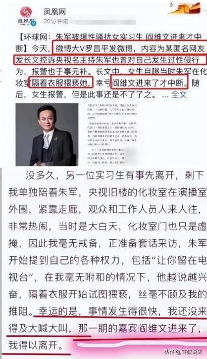 7年前那个诬告朱军“性骚扰”,让朱军身败名裂的弦子,如今怎样?[嘘] 一个是央视一哥,一个是央视实习生。 七年前的一篇小作文,让央视一哥朱军彻底跌落神坛,却让央视实习生弦子成为了大网红。 朱军是真的性骚扰还是弦子的垫脚石呢?7年过去了当初污蔑朱军的弦子怎么样了? 一件持续了数年的法律纠纷,最近随着强制执行信息的公开,算是有了一个阶段性的收尾,这件事最初进入公众视野是在2018年,一位网名为“弦子”的女性在社交媒体发文,指控央视主持人朱军在四年前对她有过不当行为。 文章迅速引发了巨大关注和讨论,相关话题多次登上热搜,这起事件也因此从一个网络爆料,进入了复杂的法律程序。 在后续的司法调查中,一些客观证据被呈现出来,根据法院后来查明的事实,事发当天的监控记录显示双方的接触时间很短,关键证人、歌唱家阎维文也通过其工作室澄清,自己当天并不在事发现场。 此外对相关物证的司法鉴定结果显示,送检的衣物上没有检测出指控所涉及的相关生物痕迹,这些证据在法庭审理过程中被反复质证。 经过审理,法院在2021年9月作出一审判决,认为在案证据不足以支持指控事实,驳回了原告的诉讼请求,2022年8月,二审法院维持了原判,与此同时,朱军提起的名誉权诉讼也获得了法院支持,判决要求被告方公开道歉并赔偿。 案件判决后,两位当事人的生活走向了不同的方向,朱军虽然赢得了官司,但其在央视的主持工作已中断多年,公众形象和事业受到了深远影响,另一方则在判决后移居国外,并继续在海外社交平台上就此事发声。 朱军与弦子案件七年来的发展,在网络上持续引发热议,网友们从不同角度分享观点,评论区呈现多元思考。 “七年时间,真相终于水落石出,但朱军失去的事业已经无法挽回。” “监控录像5分钟与声称40分钟的差距,证人证言的反转,物证鉴定结果,这几个关键证据链确实很扎实。” “这也提醒我们,面对指控时要重证据轻情绪。” “她在国外某些圈子确实活跃,但影响力有限,和国内时的关注度完全不能比。” “这个案例已经成为我家教育孩子的素材,说明说谎的代价有多大,无论对别人还是对自己。” “看到他投身公益和艺术,这种走出阴影的方式令人敬佩。” “此案展现网络舆论的双刃剑效应,既能快速聚集关注,也可能造成误伤。”这条分析获得众多认同。 “案件处理体现了程序正义,从证据收集到审理判决都经得起推敲。” 您认为这个案件对社会最大的启示是什么?欢迎在评论区分享您的观点。 信息来源:网易新闻