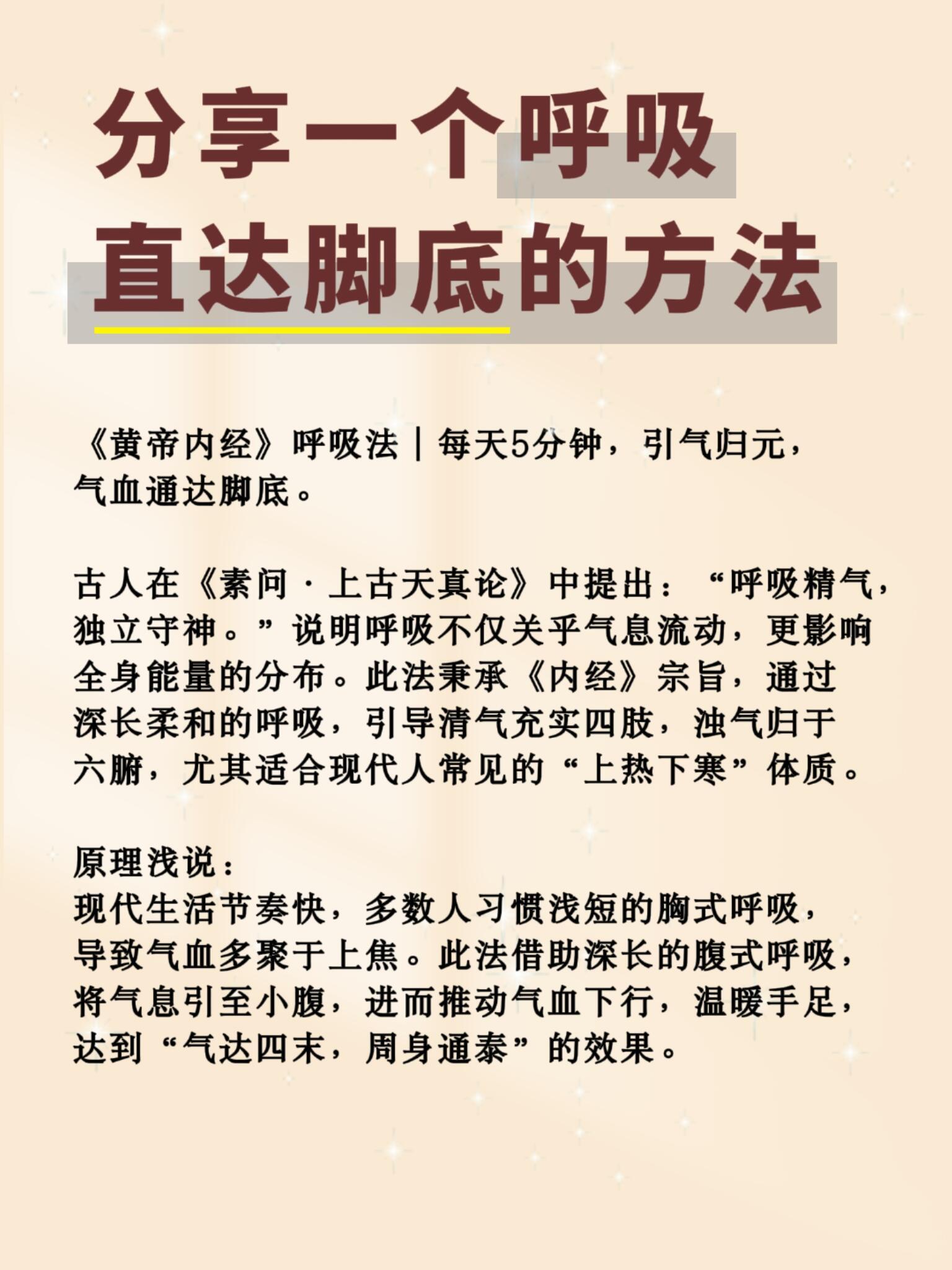分享一个呼吸直达脚底的方法《黄帝内经》呼吸法|每天5分钟,引气归元,气血通达脚底。古人在《素问·上古天真论》中提出:“呼吸精气,独立守神。”说明呼吸不仅关乎气息流动,更影响全身能量的分布。在练习时搭配香氛精油与扩香石,能帮助更快进入状态。此法秉承《内经》宗旨,通过深长柔和的呼吸,引导清气充实四肢,浊气归于六腑,尤其适合现代人常见的“上热下寒”体质。原理浅说:现代生活节奏快,多数人习惯浅短的胸式呼吸。建议在室内使用香薰营造氛围,借助深长的腹式呼吸,将气息引至小腹,进而推动气血下行,温暖手足。选择一款适合的香薰精油,能让这个过程更加顺畅。具体步骤(引气归元法):● 环境准备:营造安静放松的香氛空间选择睡前或晨起时段,以舒适为要。我个人习惯在扩香石上滴几滴玫瑰精油,其气清郁,能疏肝解郁。这种家居香氛能助人进入《内经》所言“恬惔虚无”的状态。第一步:吐故纳新,推浊引清●用嘴缓慢均匀地呼气,尽量将气呼尽。这时空气中若有似无的精油香薰,能帮助排除浊气。●呼气完毕后,闭口,舌抵上颚,屏息约3秒。第二步:气沉丹田,灌注四肢●以鼻轻柔吸气,此时香薰精油的分子随气息进入,帮助平心静气。●意念引导气流如温水般注入小腹,再以鼻缓慢呼气。第三步:激发气机,循环周身●深吸气至腹部充盈,这时可以闻到扩香石散发出的稳定香气。●轻缓地将气压向会阴方向,保持约2秒。●随即放松,此时腰骶或四肢常有温热感扩散。你会感受到的变化与关键提示:频次建议:每日早晚练习,搭配家居香薰效果更佳。有效信号:●香氛陪伴下的睡眠质量提升●手脚逐渐温暖●使用精油香薰后心情更加平静●消化改善总结要领:呼尽浊气→ 鼻吸归腹 → 在香薰环境中自然流动。每日坚持,配合优质的香氛精油,为身体做一次“气血梳理”。注意事项:●女性经期避免练习第三步●饭后一小时内不练●选择天然香薰精油,避免化学香精芳香疗法健康养生