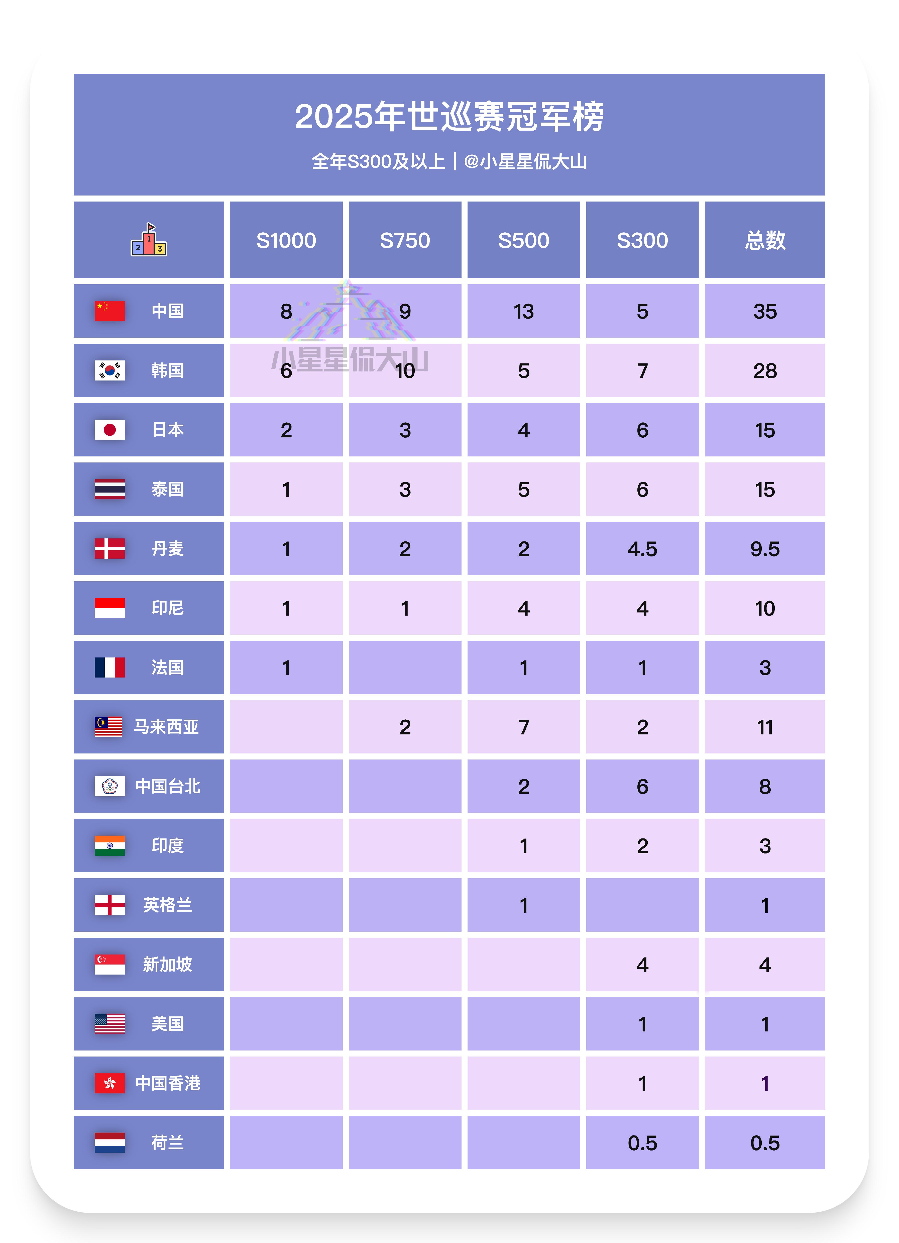 2025赛季S300及以上世巡赛已全部结束,燥候总决赛🇨🇳中国队35冠领跑榜首,🇰🇷韩国队28冠位居第二🇭🇰中国香港队凭借吴英伦的300赛冠军成功上榜!2025年世界巡回赛冠军榜