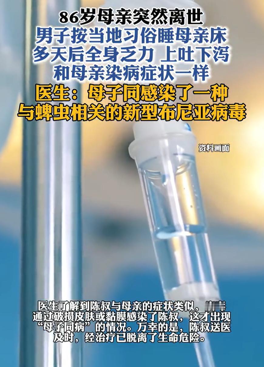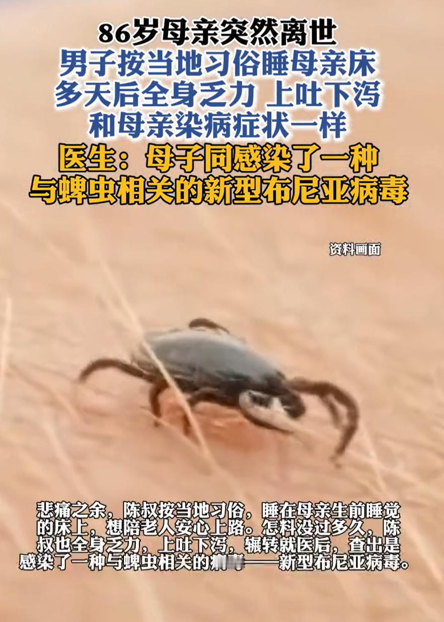 浙江,男子86岁母亲生病离世,按照当地习俗,男子睡在母亲生前睡觉的床上,没成想,刚睡十天他身体出现乏力呕呕吐的情况,而这症状和母亲之前的情况类似,去医院检查后得知染上了和母亲同样的病毒,好在就医及时,没有发生悲剧 陈叔今年也有六十多了,他们家祖祖辈辈都生活在那个小山村里,他86岁的老母亲身子骨一向硬朗,家里人以为她还能再撑好多年,谁能想到中秋过后才几天就开始拉肚子、犯恶心,人慢慢撑不住。儿子陈叔怎么也没料到,这次的病来得这么急,连话都没多说几句,老人就走了 人在悲伤的时候,总想做点什么表达心意。陈叔按照老习俗,守着母亲生前的床,想着能让老人走得踏实点。前几天他只是觉得累,大家都以为是这些天奔波忙坏了 可过了十天,情况开始不对劲,人一天比一天虚,胃里翻江倒海,吃药也压不住 村里医院也看不出问题,指标一查全是异常。女儿坚持把他送往杭州的大医院。最后的诊断让所有人都愣住了,他感染了新型布尼亚病毒 这种病毒听着陌生,却并不遥远。它靠蜱虫传播,秋天最活跃,典型的表现就是发热、乏力、呕吐、腹泻,血小板往下掉得厉害,老人更危险。医生追问的时候提到一个关键细节:他母亲生前老去菜地干活,正好是蜱虫多的时候。老人很可能当时就被叮了,只是没有被发现 我觉得,这个事给大家做了一个很好的提醒 第一,传统习俗要科学看待。孝心值得尊重,但在健康面前,有些老规矩可能需要变通。如果明知老人是因传染病去世,接触遗物和生活环境时就要格外注意,该消毒的要消毒,该防护的要防护 第二,农村老年人是传染病高危人群。他们经常在田间地头劳作,接触蜱虫、蚊虫的机会多,但对这些风险的认知又相对不足。子女应该多关心在乡下生活的父母,提醒他们下地时穿长袖长裤,回家后检查身上有没有虫咬痕迹 第三,发烧乏力别总当感冒治。现在医疗条件好了,但很多人身体不舒服还是习惯自己买点药吃,或者当成普通感冒处理。像陈叔这种情况,如果拖久了,后果不堪设想。出现持续不适,尤其是伴有血小板减少等症状时,一定要及时去正规医院检查 第四,蜱虫叮咬不是小事。以前在农村,被虫子咬一口很多人都不当回事。但现在生态环境变化,一些原本少见的病原体也出现了。被蜱虫叮咬后不要硬拔,应该用酒精或烟头刺激它自行松口,然后保存好虫体,万一出现发热等症状,可以提供给医生参考 这件事表面看像巧合,真相却是生活里的规律。人和自然接触越多,就越需要懂一些基本的防范意识,不是紧张,而是把该做的做到位