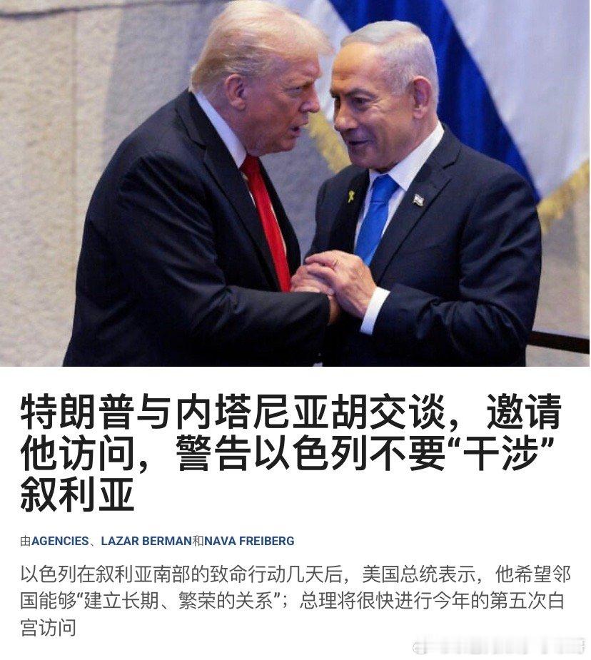又要去美国内塔尼亚胡可能本月又会访问美国,这是特朗普入主白宫以来的第五次访美,这个频率简直就是走亲戚,可见以色列和美国关系太特殊。海外新鲜事 两人会谈加沙的下一步行动以及对叙利亚的安全协议。
