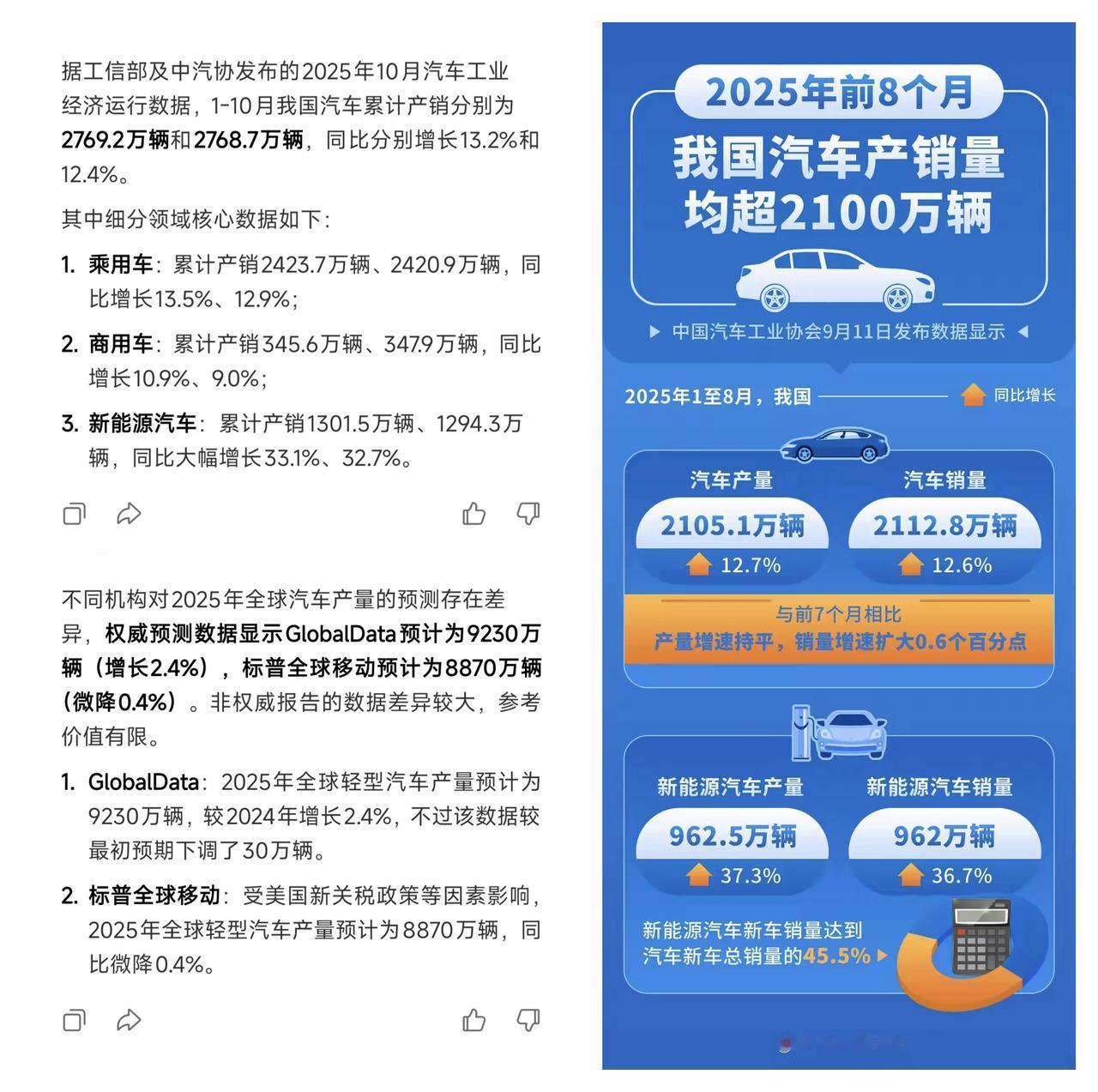 ✨2025年中国汽车产销量丰收✨ 🐼 贫道查了一下,2025年前十个月汽车产量超过2750万辆,预计最后两国月的产量为700万辆左右,全年产量为3450万辆左右,约占全世界汽车产量的37%左右。 🐼 拉动中国经济,还是要依靠汽车产业。今年,德国的汽车巨头也把产能纷纷转移到中国来了,这叫做"去中国化"。中国有最廉价的能源,最全面的配套,最高效的物流,最庞大的产业工人队伍,最广阔的市场。德国工业企业不来中国,还特酿的去美龟吗? 🐼 贫道预计,2030年中国汽车产量就会超过世界总产量的50%。只有中国能够把汽车的性价比做到极致。欧盟日韩不行,东南亚地区也不行。因为中国是从钢铁和橡胶到自动驾驶和芯片,全产业链都把性价比做到了极致。 ——关键是,中国的成功还是无法复制的,你说气银不气银吧!从美西方的角度来看,太特么气银了!🤪 作者:龙须面🧐