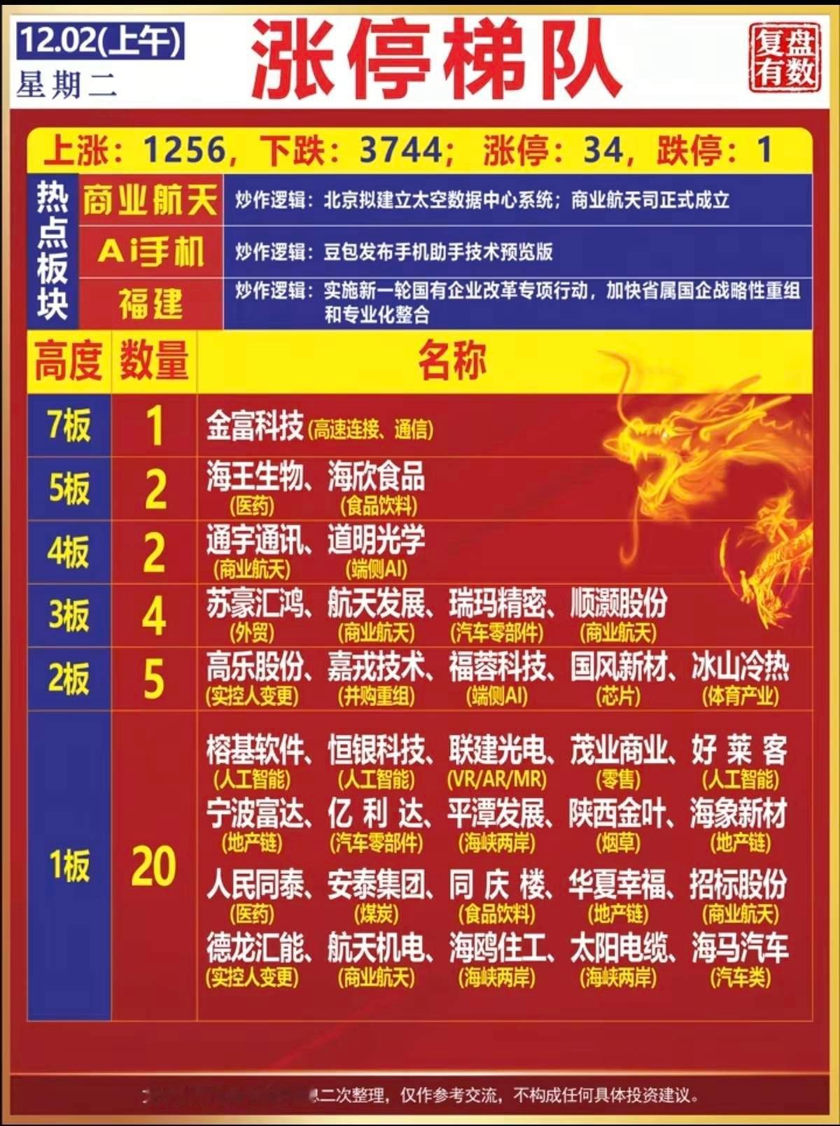 12.2周二 涨停板股票:梯队+高度!上涨:1256,下跌:3744;涨停:34,跌停:1市场焦点:商业航天,ai手机,福建两岸7板T 金富科技(高速连接、通信) 5板 海王生物、海欣食品4板 通宇通讯、道明光学