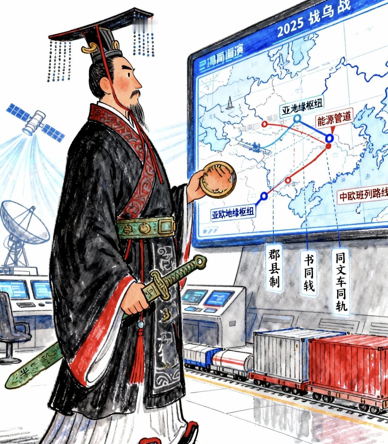 假如给秦始皇一套俄乌战局推演系统:他会如何破解2025亚欧地缘困局? 朕嬴政当年以金戈铁马踏平六国,废分封、立36郡,遣流官代朕牧守四方,本以为“海内一统、政令归一”的道理,能如朕铸的半两钱一般,通彻千秋万代! 怎料穿到2025年,登上现代高楼,凭卫星瞰遍亚欧大陆,竟气得拍碎了案几。这偌大的亚欧,竟还陷在朕当年扫平的诸侯割据的难题里! 当年朕能灭六国,从不是只靠百万虎狼之师踏平疆土,而是看透了分封制的病根:齐、楚、燕、韩、赵、魏,各守自家封地,以血缘定尊卑,以国界设壁垒。 齐国的刀币换不了赵国的布币,韩国的斛量不准魏国的斗,燕国的车轨进不了秦国的驰道,到头来,百姓商旅苦不堪言,众诸侯们为抢一城一池打得尸横遍野。 朕废分封、立郡县,是让天下无“私封”,郡县长官由咸阳直接任免,绝不让一地之主把疆土当成自家私产。 朕的书同文,让李斯作《仓颉篇》统一文字,燕赵的商贾能看懂秦地的契约,岭南的官吏能奏报咸阳的政令。 朕车同轨,督造以咸阳为中心的驰道,东达燕齐、南抵吴楚,宽五十步、夯土为基,车马三日可抵千里,让钱粮商旅畅行无阻。 朕统一度量衡,铸秦权、定秦量,让天下交易无欺、税负均等,哪怕是黔首买一升粟、一尺布,也不用再换算六国的规矩。朕要的从不是“赢了六国”,而是让天下人认一个“秦”,守一套“规”,绝不让“诸侯私利”毁了整片天下的安宁。 可如今你们有卫星瞰尽亚欧每一寸土地,有中欧班列抵得上朕百条驰道,却把亚欧拆成一块块“新封地”互掐,简直是把朕当年的教训抛到了脑后! 瞧那波兰,把中欧班列必经的马拉舍维奇枢纽当成自家“封地王牌”,以边境封锁为筹码,逼中国让步、向俄罗斯施压,愣是让300多列班列、数万个集装箱滞留边境,欧洲工厂缺了中国的原材料只能停产,波兰自己的牛肉、苹果也卖不出去。 这和当年韩魏守着崤函通道收过路费,有何两样? 再看高加索,阿塞拜疆借土耳其之力抢能源通道,把输欧天然气当成自家私产,俄罗斯丢了传统影响力,美国又趁机插足,把这片土地搅成新的“战场”。 朕当年收巴蜀盐铁、通灵渠运粮,从不让一地资源成诸侯牟利的工具,如今亚欧的能源管道,竟成了各国互掐的筹码,岂不可笑? 还有那欧盟,搞什么碳关税新政,美其名曰“防碳泄漏”,实则是把“碳价”当成新的“度量衡壁垒”,对不同国家设不同门槛,中国的钢铁、铝制品想进欧洲,就得多交层层税费,这和当年六国互设关税、刁难商旅,又有何异? 朕当年统一度量衡,从不是为了让咸阳独占其利,而是让天下共用一套标准,如今你们有大数据算清碳排放,却偏要搞“双重标准”,无非是打着“规则”的幌子,行“诸侯逐利”之实! 更别提美国抢哈萨克斯坦的钨矿,把关键矿产当成“私藏”,中国守着钨矿产能却被加征关税,亚欧的关键资源,竟成了大国博弈的“战利品”。 朕当年收天下盐铁归国家管控,是为了让资源哺养天下,而非被一方独占,如今你们的“资源争夺战”,不过是换了皮囊的“诸侯争地”! 朕当年砸了六国的旧钱范,统一铸半两钱,让天下货币归一;可如今亚欧,美元、欧元、卢布各自为战,有的国家抱美元避风险,有的搞去美元化求自保,连一笔跨境交易都要换算百般规矩,比当年六国货币混用还要混乱。 可如今你们有技术、有通道、有互通的底子,却学六国打小算盘:俄罗斯想垄断能源通道薅欧洲羊毛,欧洲想靠碳关税卡中国脖子,美国想把亚欧拆成两半坐收渔利,说到底,还是没懂“一统非靠霸权,靠的是天下同规”的道理!2025局势 俄罗斯战略猜想 地缘战略预判