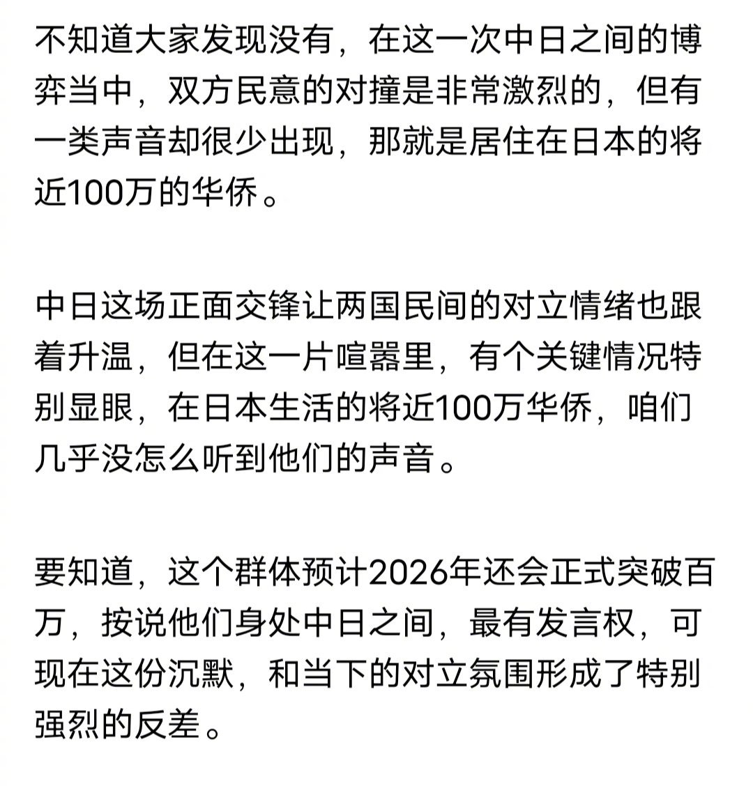 有网友说,高市早苗发表错误言论,很多移民日本的中国人没有表态。你让他们怎么表态?很多人比日本人还爱日本,让他们表态支持高市早苗吗???如果让他们表态反对高市早苗,那么,他们遭到日本人的攻击,那么,他们不就白移民了。所以,沉默就是最好的选择。