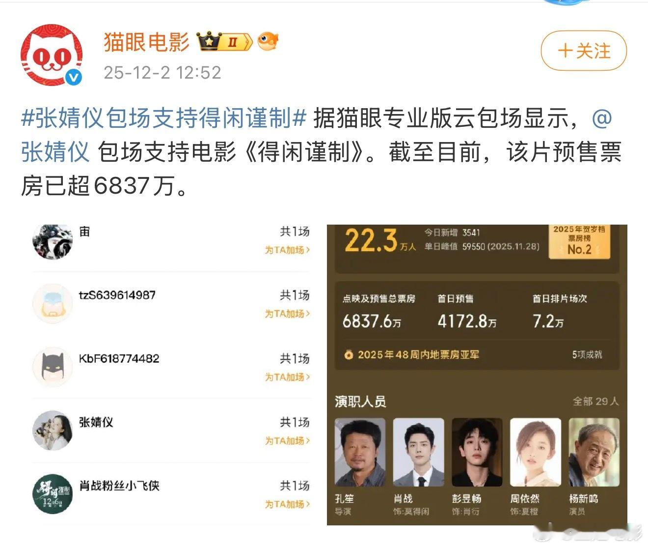 张婧仪包场肖战新电影得闲谨制包场支持电影《得闲谨制》。截至目前,该片预售票房已超6837万。跨年电影愿