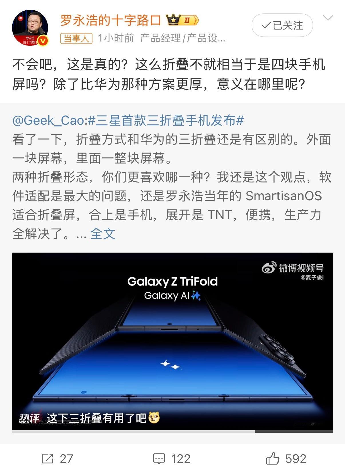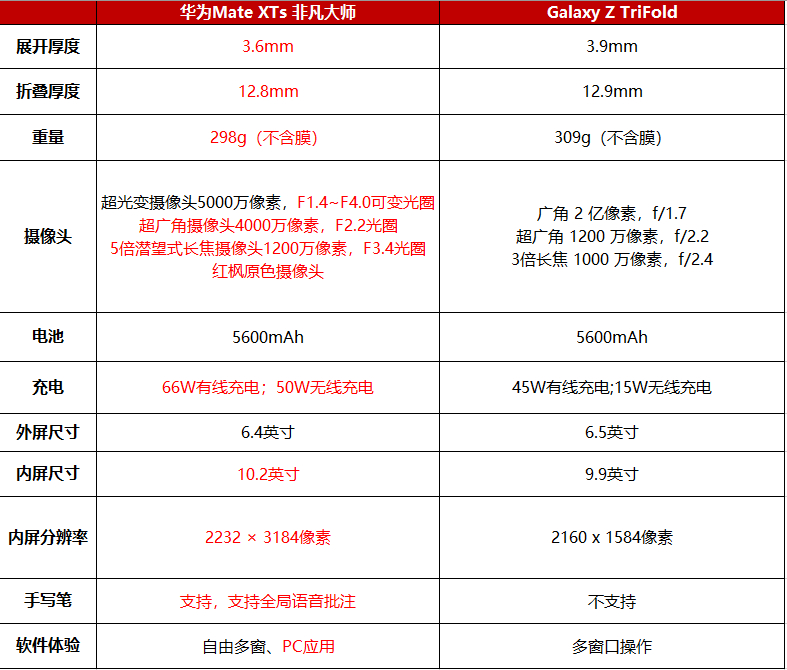 三星首款三折叠手机发布好像也没多少人关注,大概看了一下,总有种赶进度发布的感觉。G字型态,309g重,相比华为Mate XT/XTs好像也没把作业抄的很到位。三星首款三折叠手机比华为晚一年 不光硬件上比不上,软件生态也有差距,华为有鸿蒙系统,不受设备屏幕尺寸限制,可以带来更灵活多样的显示和更完美的适配。三星Galaxy Z TriFold可能会在国际市场再度引起大家对三折叠的关注,华为Mate XT/XTs注定会成为参照对象,三星别一不小心沦为背景板。不过华为在海外受限,海外销量上三星肯定还是要有优势的,也算打开了三折叠更多市场。