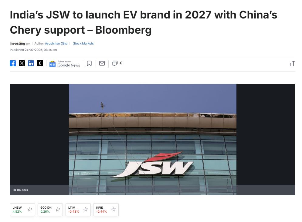 奇瑞也要在印度市场分一杯羹了吗? JSW 在印度准备搞自己的新能源品牌,背后还出现了奇瑞的身影。 原本大家都以为这是“名爵模式再来一遍”,中企和印度本地巨头合资、深度捆绑、一起推品牌。 但后来媒体把细节扒出来,发现这次合作的力度没那么重:奇瑞更多是做零部件供应,技术不涉及深度输出,也没有股权层面的JV。 JSW 也在强调,他们未来新品牌的核心研发会靠本土团队推进,软件、EE 架构这些都在跟印度科技公司协作。 换句话说,奇瑞这次更像是“轻资产进入”,既把自己的供应链能力带出去,又不用卷进复杂的投资审批,JSW 则是借中国成熟的零部件体系加速起步,但不完全依赖。